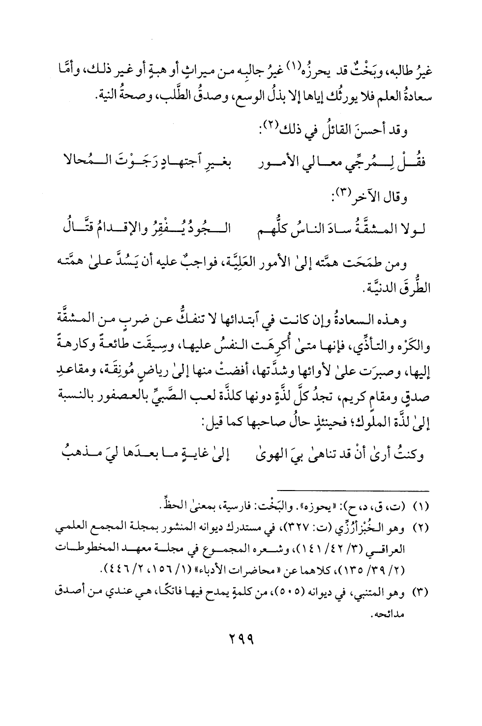 سعادة العلم فلا يورثك إياها إ لا بذل الوسع، وصدق الطلب، وصحة النية.