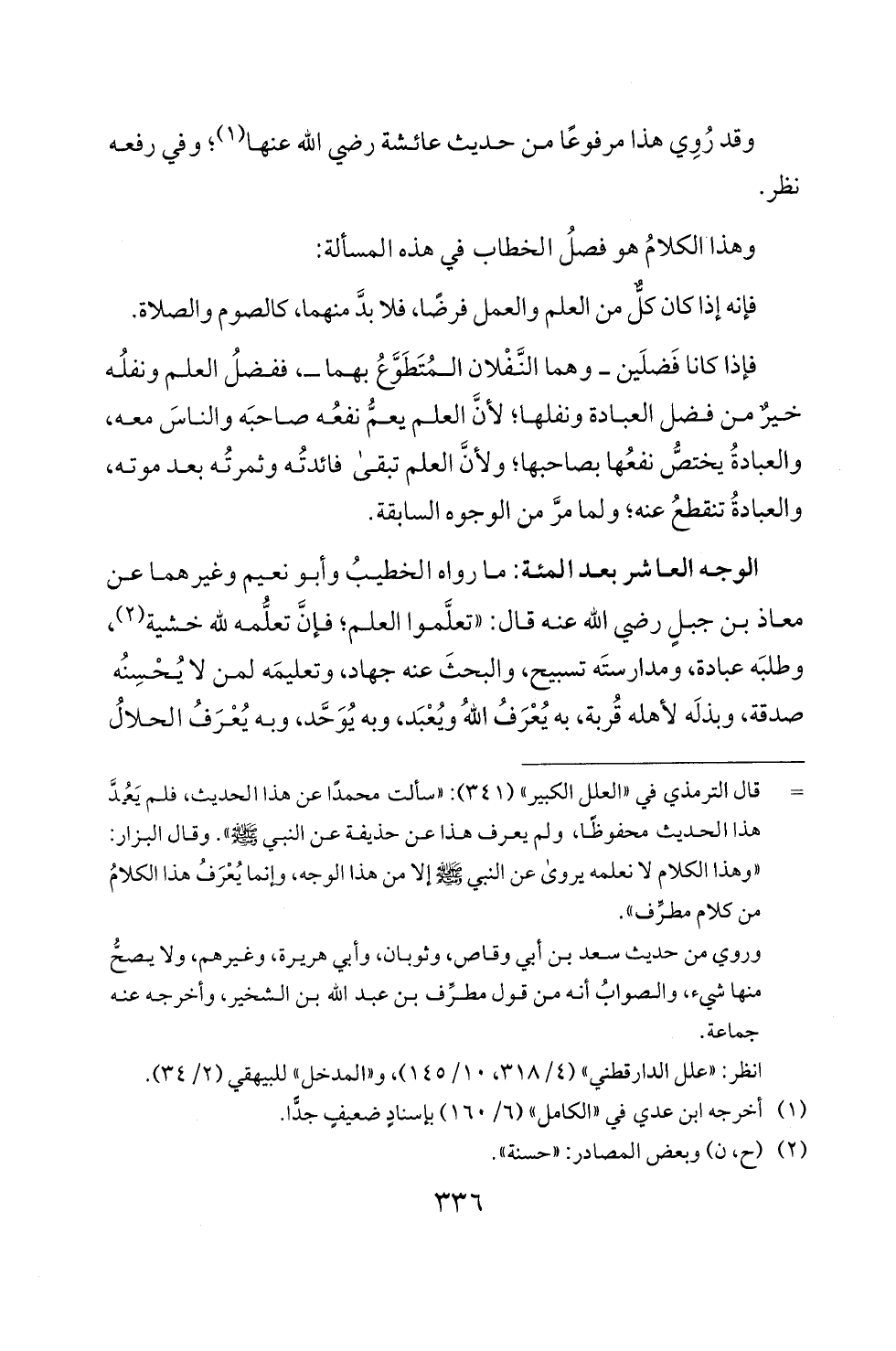وطلبه عبادة، ومدارسته تسبيح، والبحث عنه جهاد، وتعليمه لمن لا يحسنه