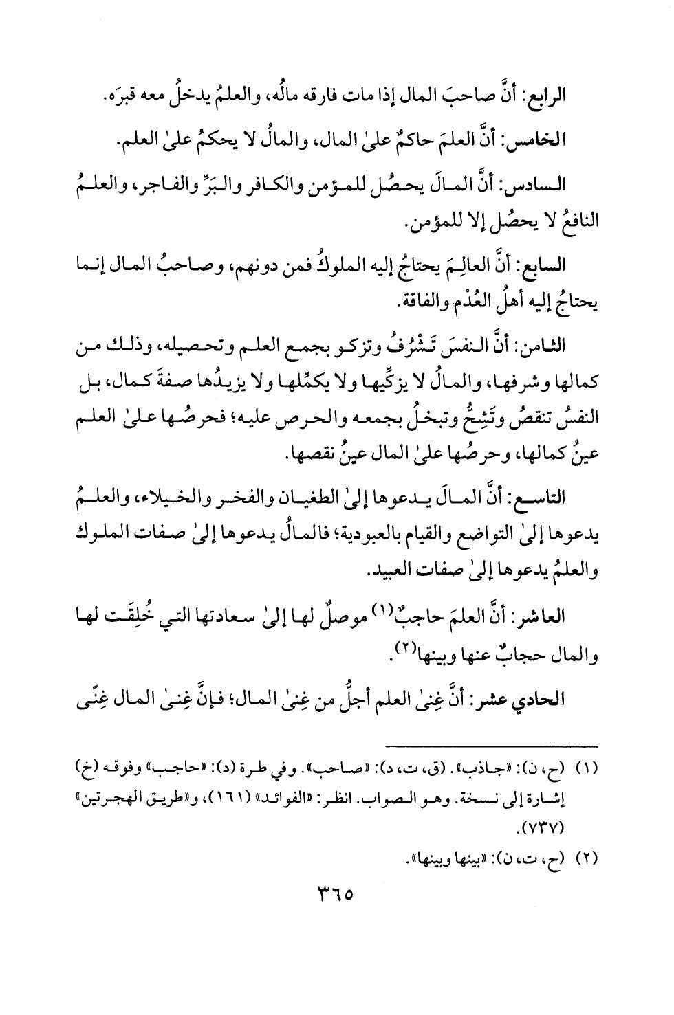 الحادي عشر: ان غنى العلم أجل من غنى المال؛ فإن غنى المال غنى