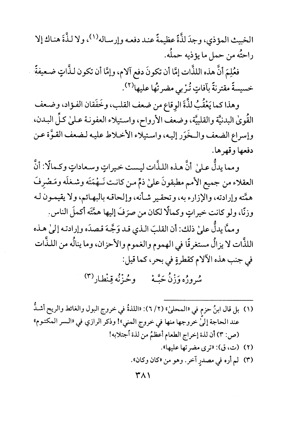 فعلم أن هذه اللذات إما أن تكون دفع آلام، وإما أن تكون لذات ضثيفةس