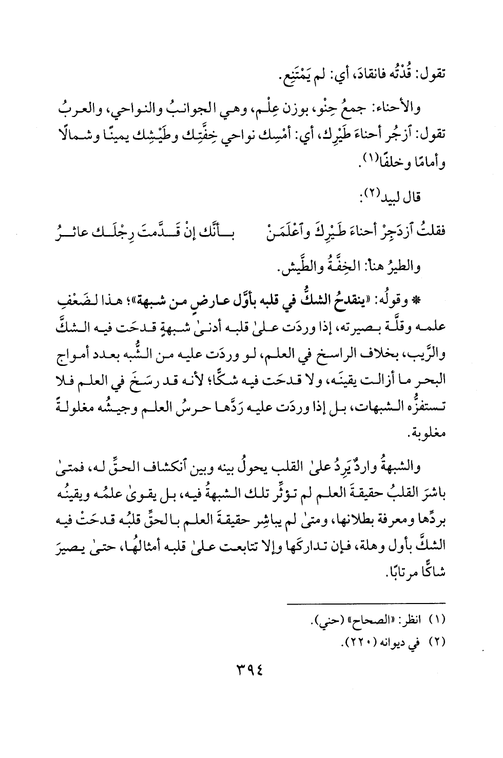 تقول: ازجر أحناء طيرك، أي: أمسك نواحي خفتك وطيشك يمينا وشمالا