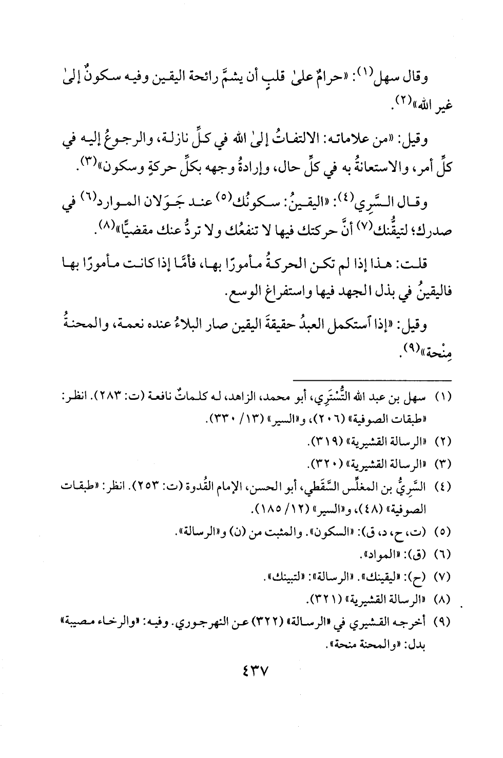 وقال السري (4): "اليقين: سكونك (5) عند جولان الموارد (6) في
