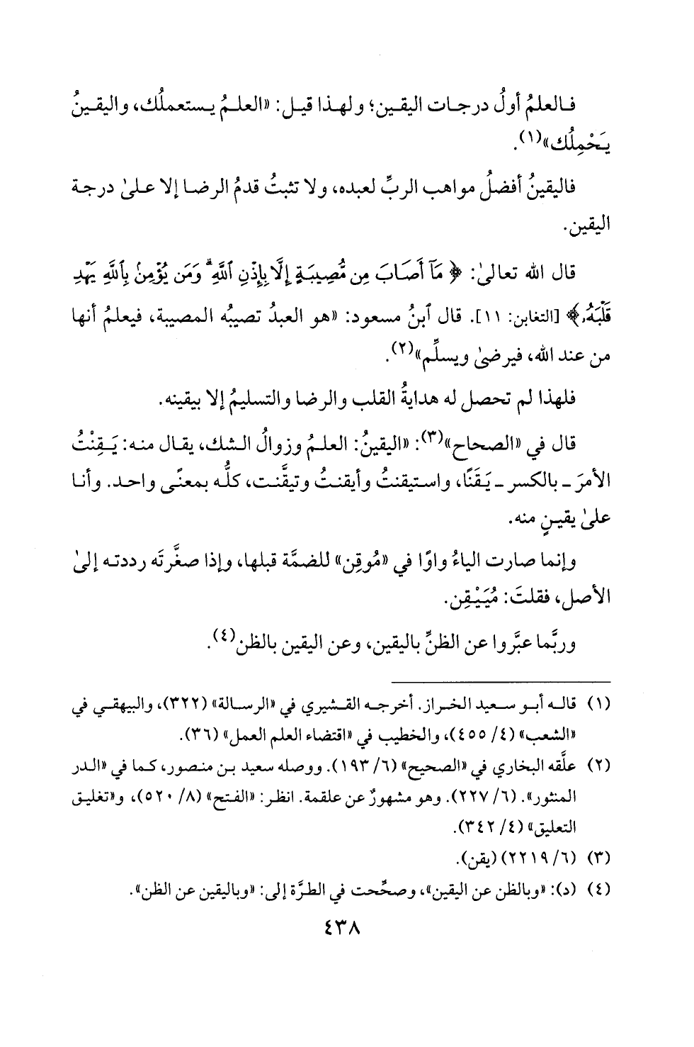 فاليقين أفضل مواهب الرب لعبده، ولا تثبت قدم الرضا إلا على درجة