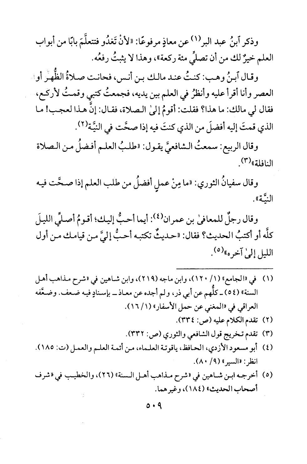 وذكر ابن عبد البر (1) عن معاذ مرفوعْا: "لان تغدو فتتعلم بابا من ابواب