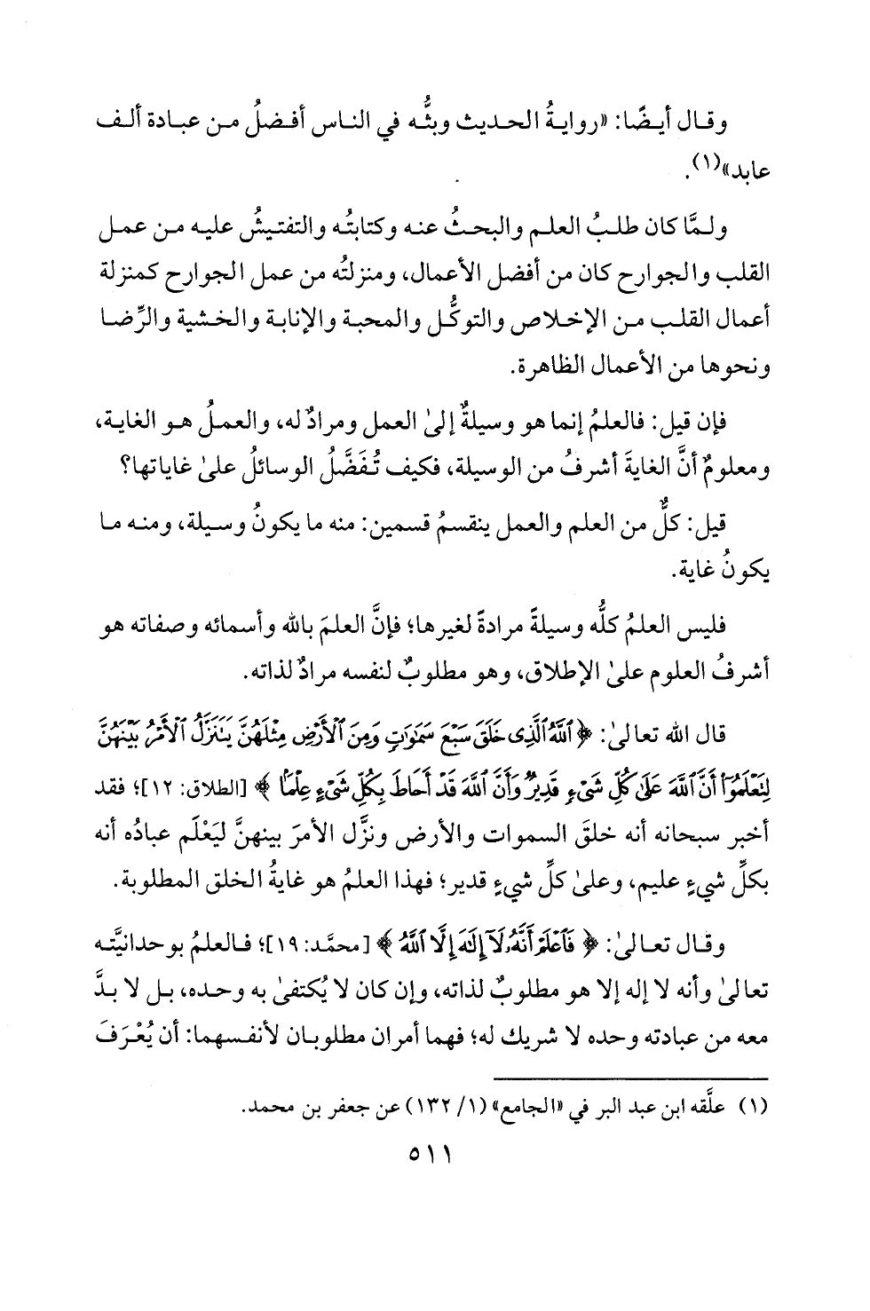 فليس العلم كله وسيلة مرادة لغيرها؛ فإن العلم بادله واسمائه وصفاته هو