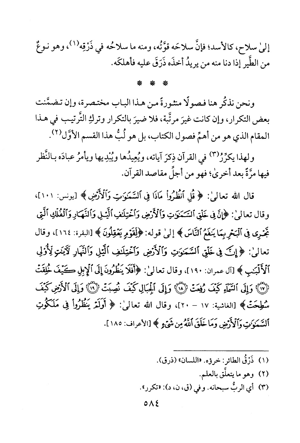 ولهذا يكرر (3) في القران ذكر آياته، ويعيدها ويبديها ويأمر عباده بالنطر