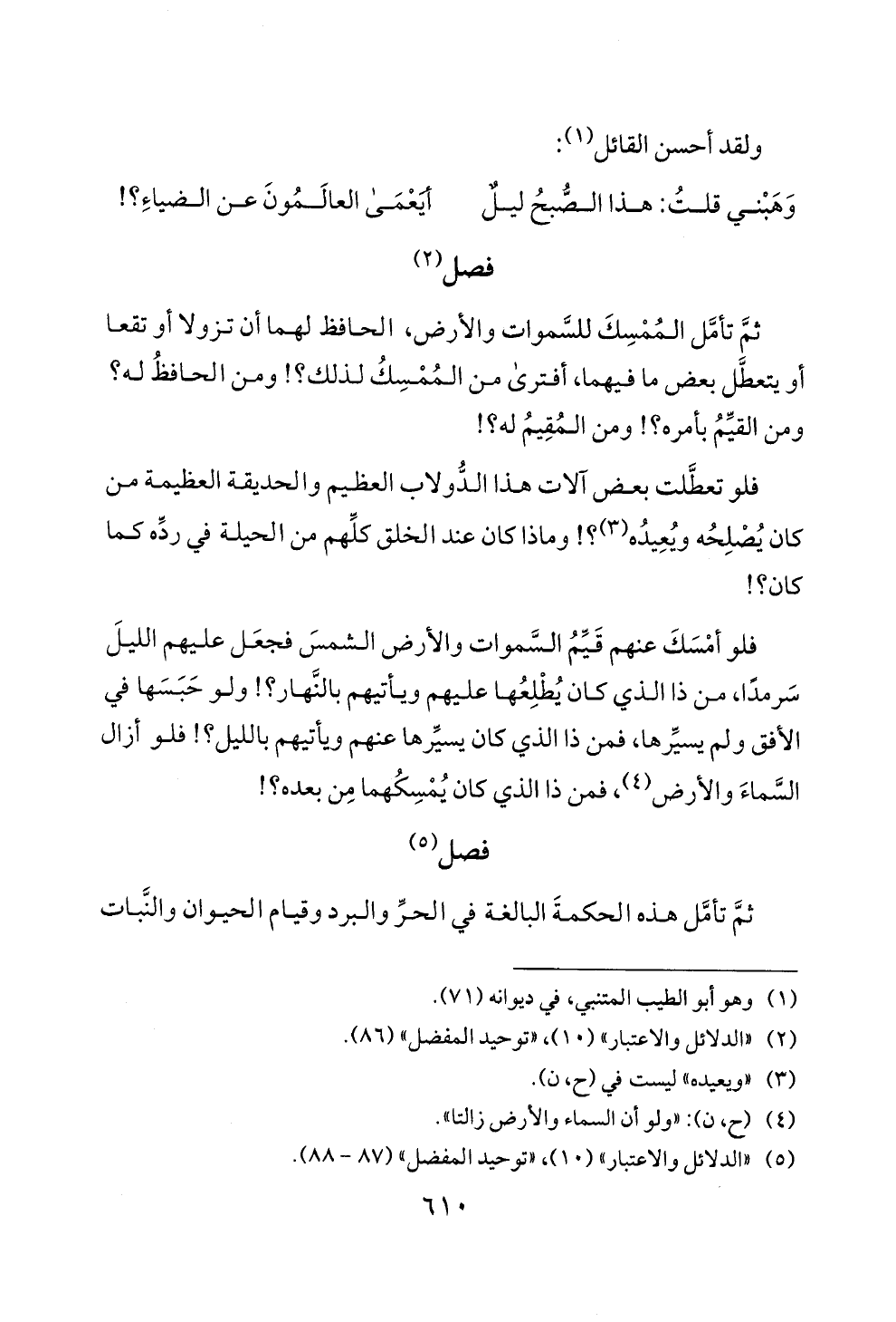 (5) "الدلائل والاعتبار" (0 1)، "توحيد المفضل، (87 - 88).