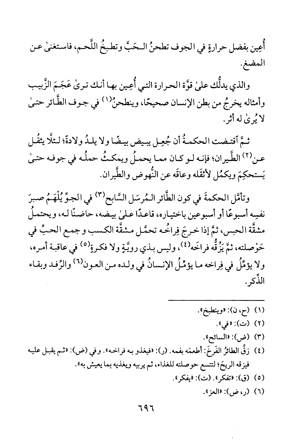 (4) زق الطائر الفرخ: أطعمه بفمه. (ر): "فيغذو به فراخه ". وفي (ض): "ثم يقبل عليه