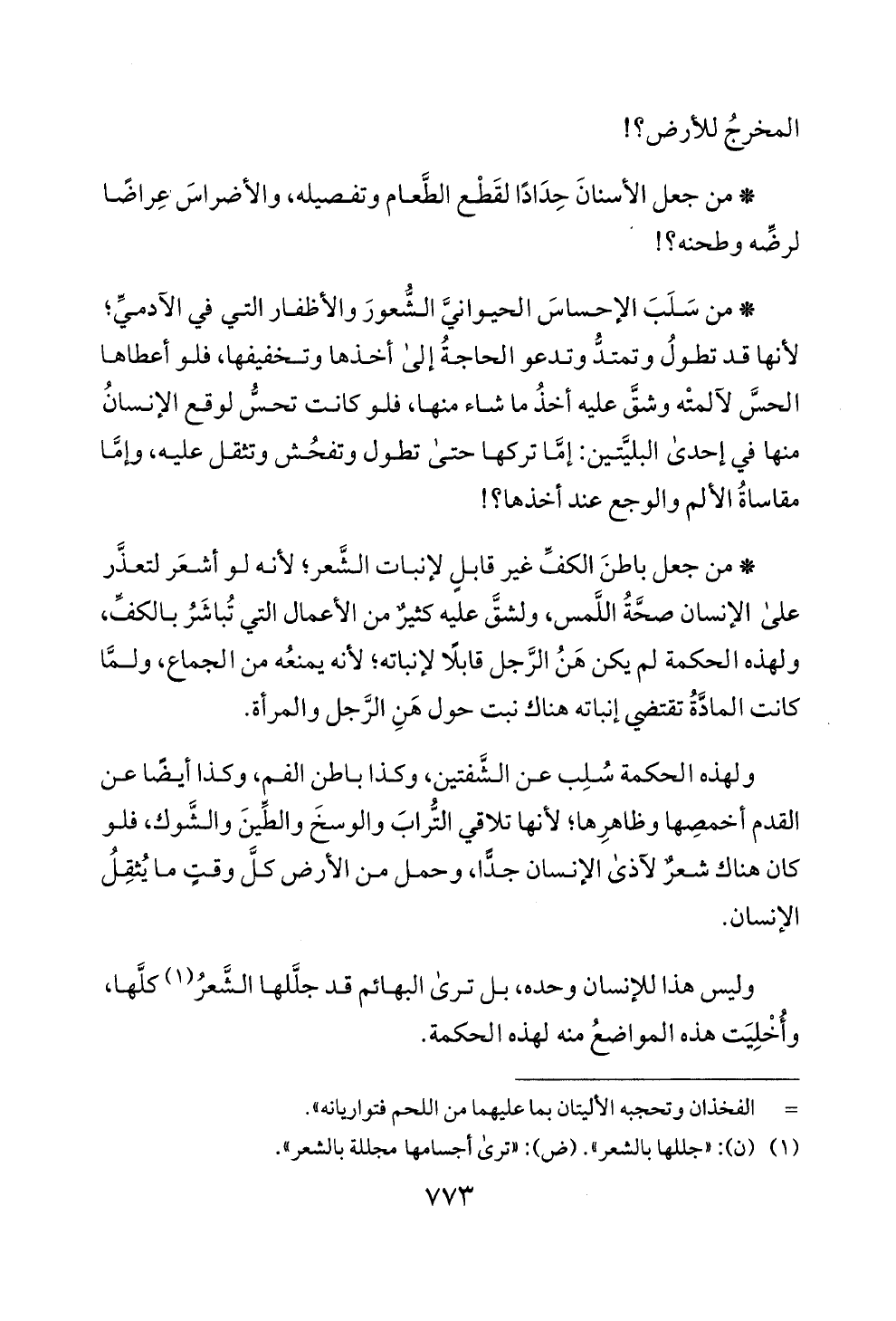 * من جعل باطن الكف غير قابل لانبات الشعر؛ لانه لو أشعر لتعذر