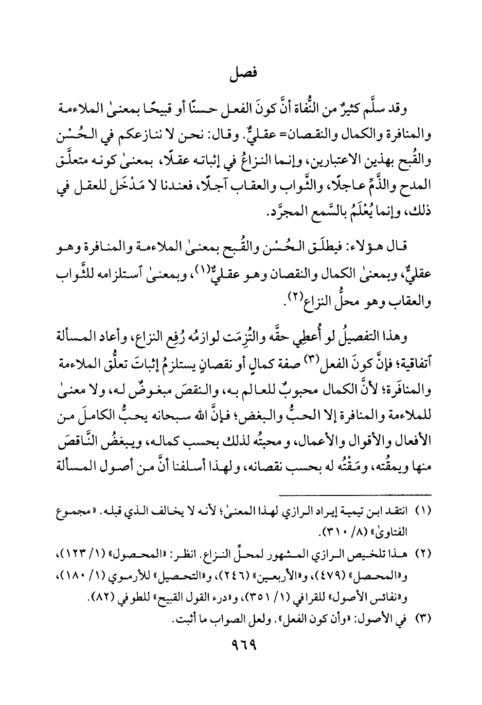 وقد سلم كثير من النفاة ن كون الفعل حسنا أو قبيحا بمعنى الملاءمة
