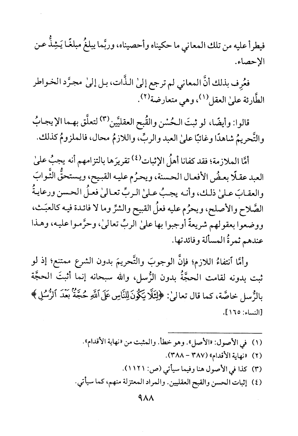 (4) إثبات ا لحسن و [لقبح العقليين. والمراد المعتزلة منهم، كما سيأتي.