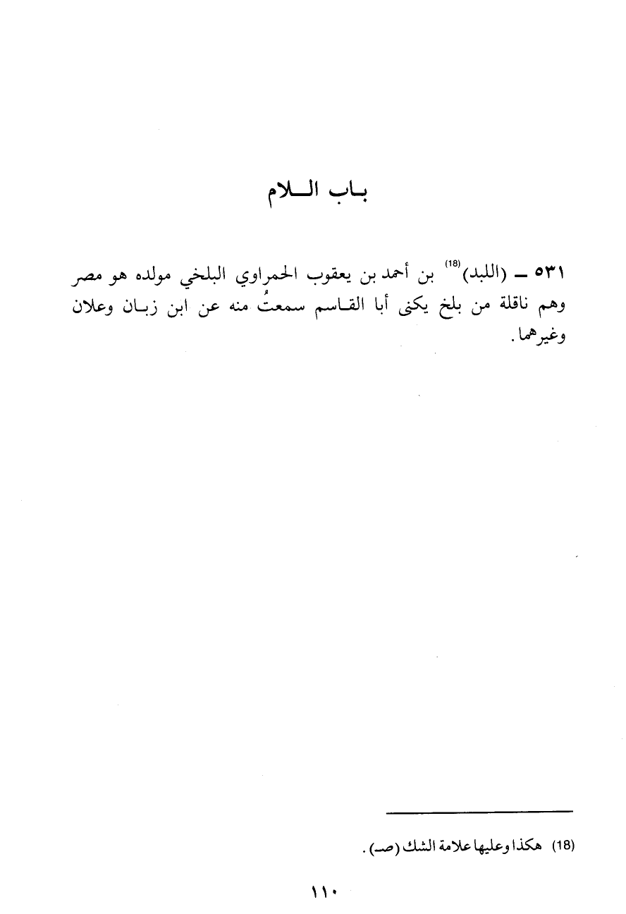 531 - (اللبد) (¬18) بن أحمد بن يعقوب الحمراوي البلخي مولده هو مصر وهم ناقلة من بلخ يكنى أبا القاسم سمعتُ منه عن ابن زبان وعلان وغيرهما.