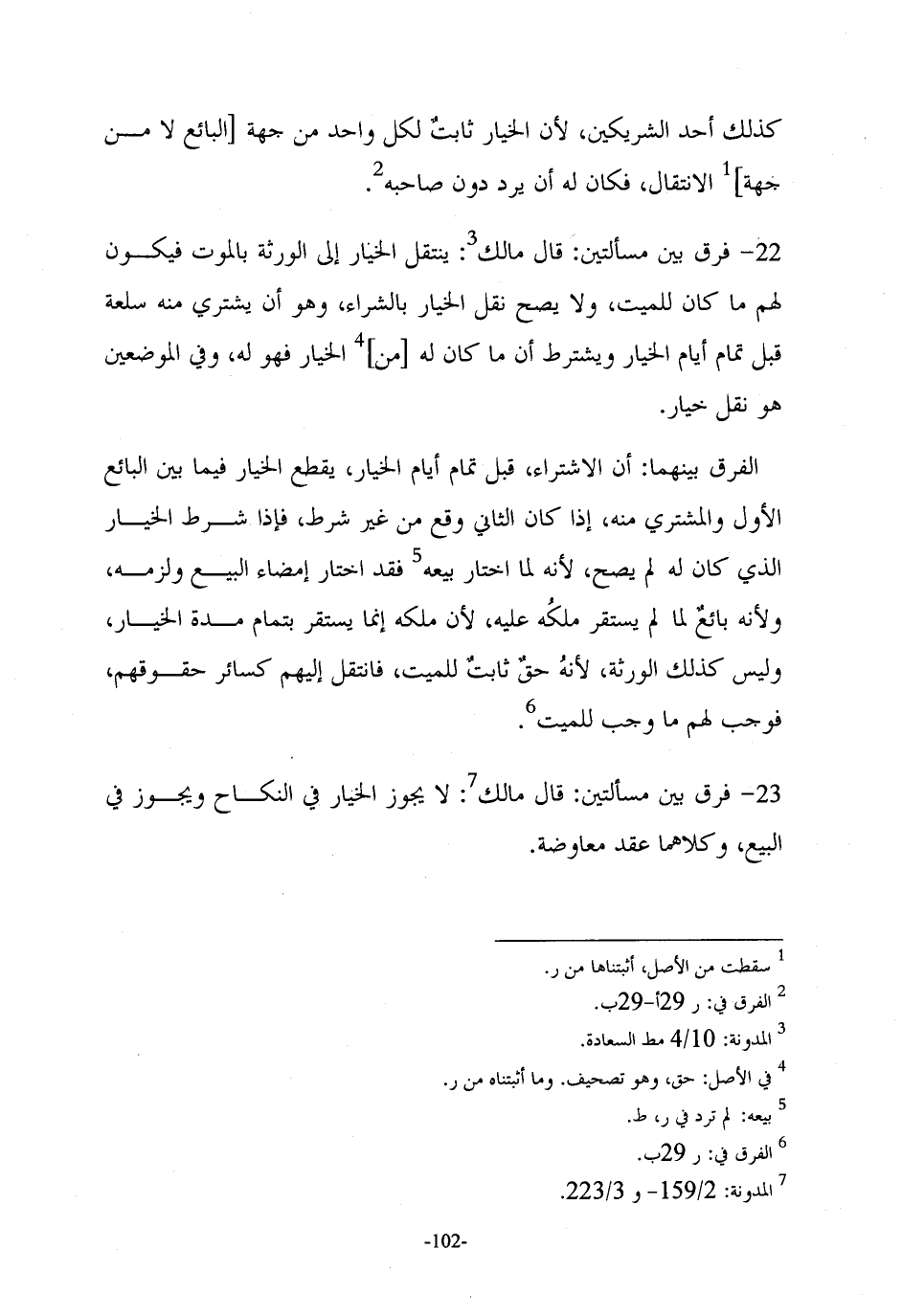 22 - فرق بين مسألتين: قال مالك (¬3): ينتقل الخيار إلى الورثة بالموت فيكون لهم ما كان للميت، ولا يصح نقل الخيار بالشراء، وهو أن يشتري منه سلعة قبل تمام أيام الخيار ويشترط أن ما كان له [من] (¬4) الخيار فهو له، وفي الموضعين هو نقل خيار.