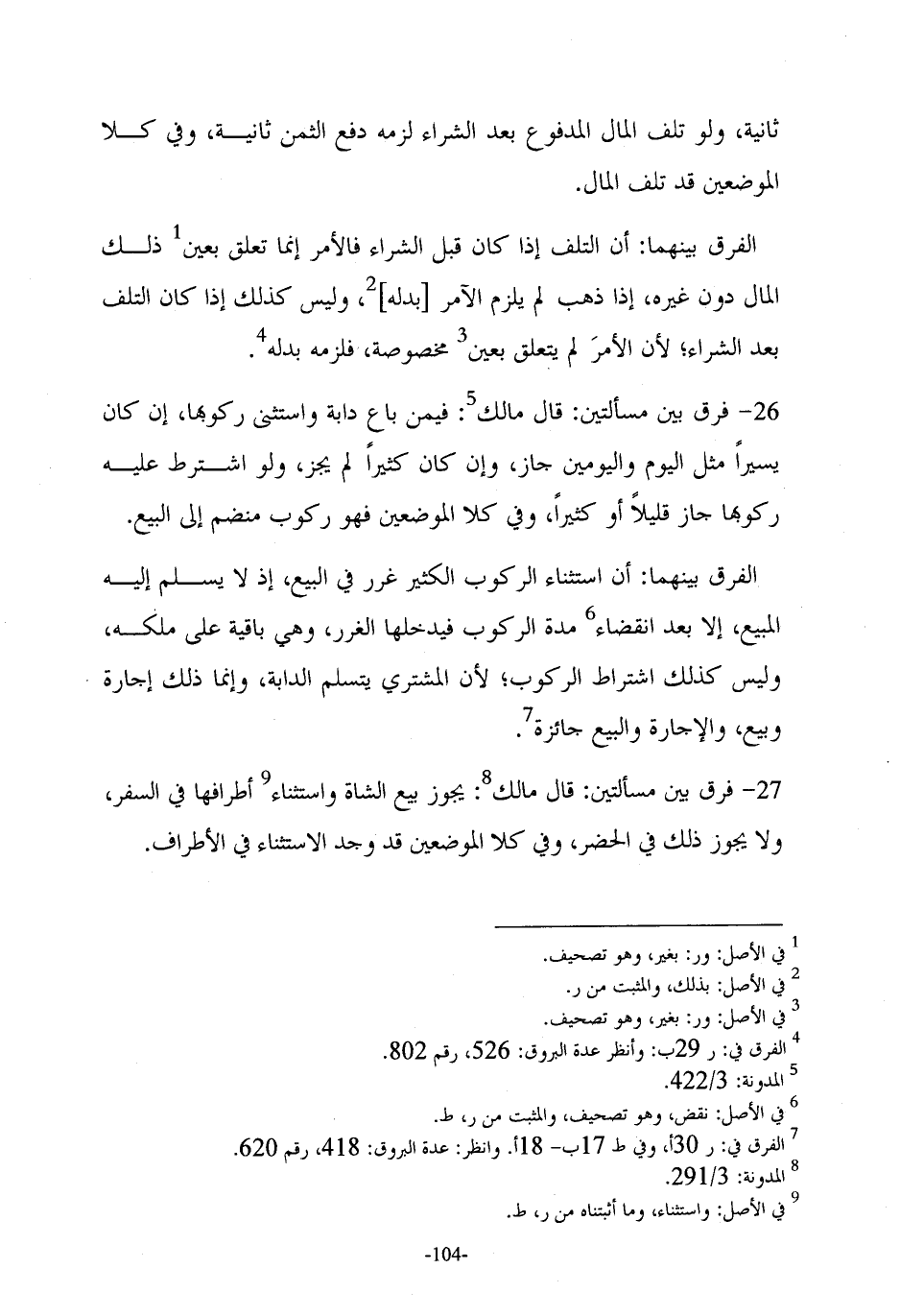 (¬4) الفرق في: ر 29 ب: وانظر عدة البروق: 526، رقم 802.