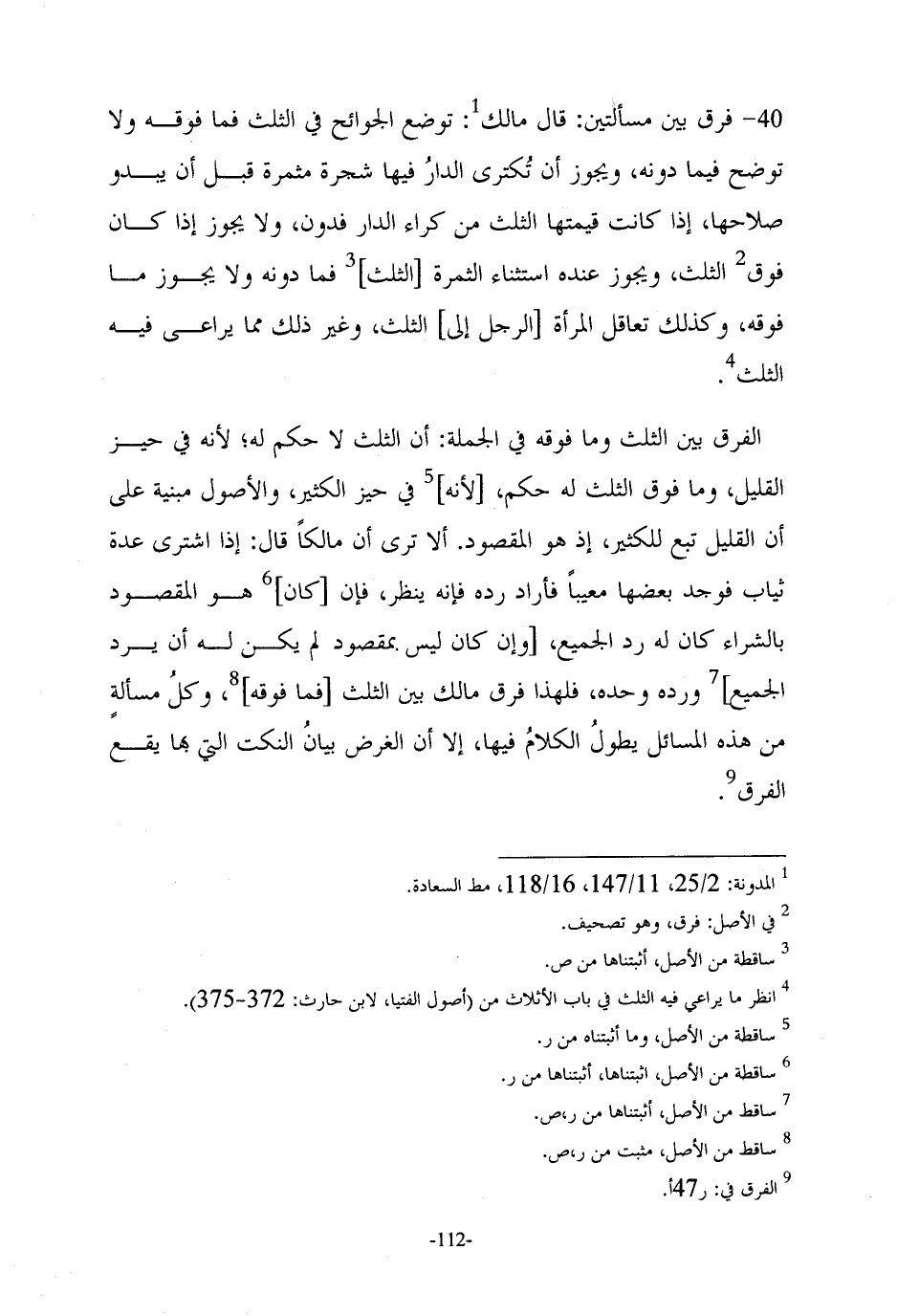 الفرق بين الثلث وما فوقه في الجملة: أن الثلث لا حكم له؛ لأنه في حيز القليل، وما فوق الثلث له حكم، [لأنه] (¬5) في حيز الكثير، والأصول مبنية على أن القليل تبع للكثير، إذ هو المقصود. ألا ترى أن مالكًا قال: إذا اشترى عدة ثياب فوجد بعضها معيبًا فأراد رده فإنه ينظر، فإن [كان] (¬6) هو المقصود بالشراء كان له رد الجميع، [وإن كان ليس بمقصود لم يكن له أن يرد الجميع] (¬7) ورده وحده، فلهذا فرق مالك بين الثلث [فما فوقه] (¬8)، وكلُ مسألةٍ من هذه المسائل يطولُ الكلامُ فيها، إلا أن الغرض بيانُ النكت التي بها يقع الفرق (¬9).