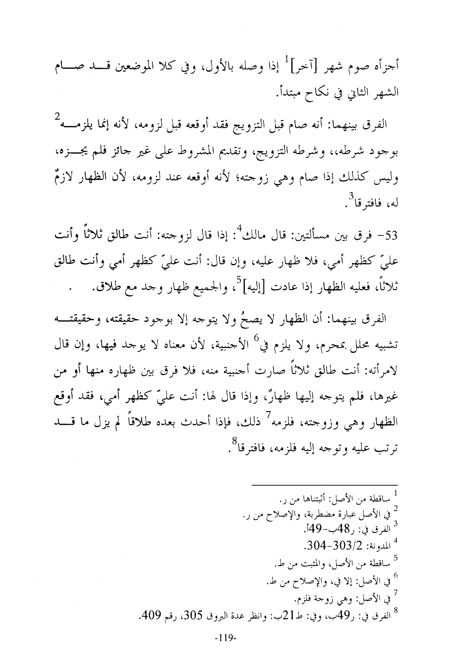 (¬8) الفرق في: ر 49 ب، وفي: ط 21 ب: وانظر عدة البروق 305، رقم 409.