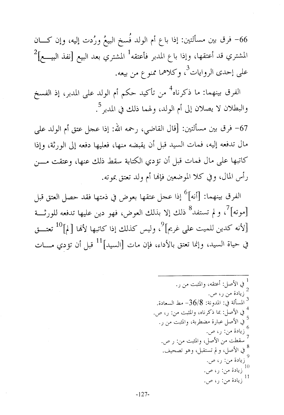 67 - فرق بين مسألتين: [قال القاضي، رحمه الله: إذا عجل عتق أم الولد على مال تدفعه إليه، فمات السيد قبل أن يقبضه منها، فعليها دفعه إلى الورثة، وإذا كاتبها على مال فمات قبل أن تؤدي الكتابة سقط ذلك عنها، وعتقت من رأس المال، وفي كلا الموضعين فإنها أم ولد تعتق بموته.