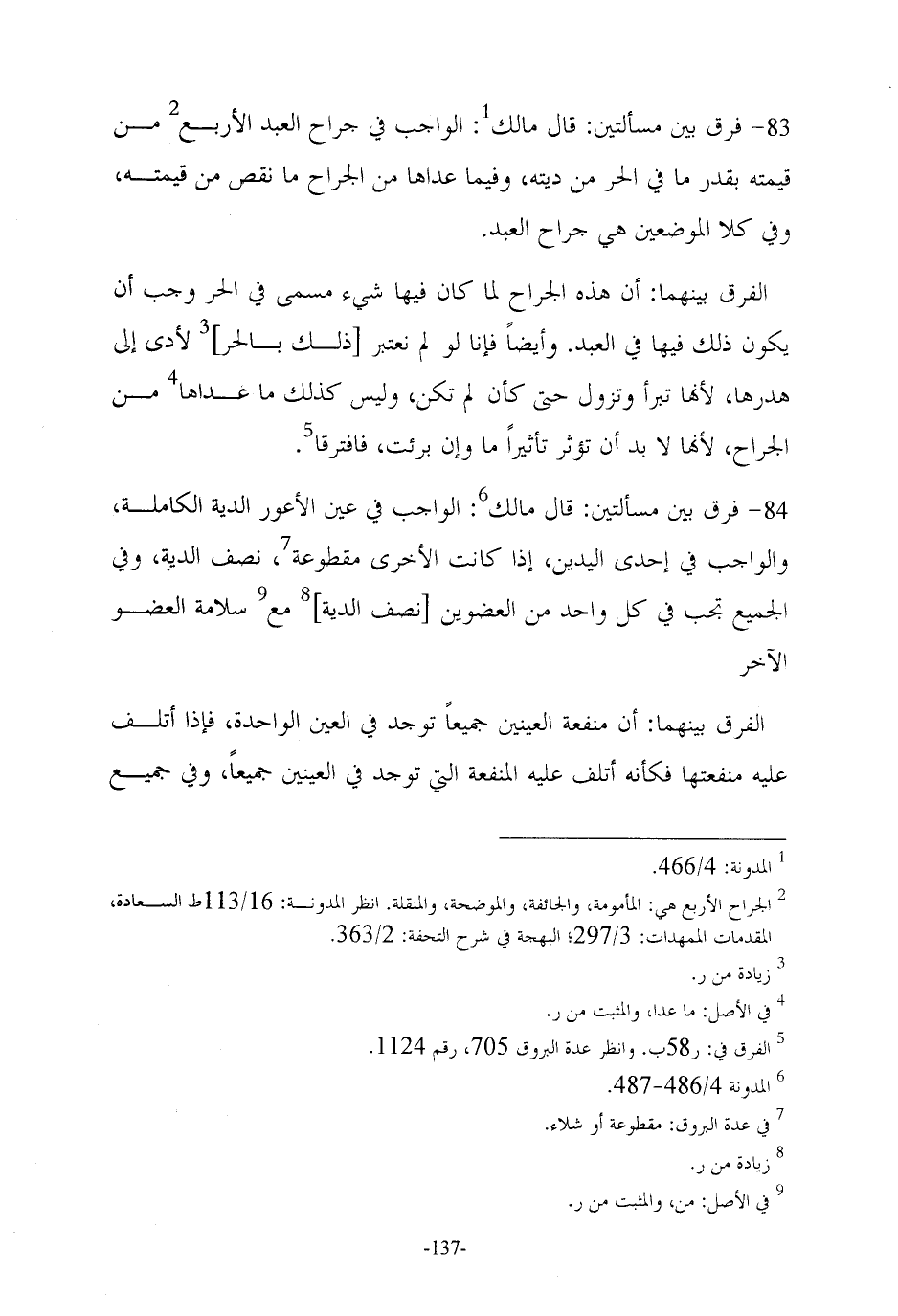 83 - فرق بين مسألتين: قال مالك (¬1): الواجب في جراح العبد الأربع (¬2) من قيمته بقدر ما في الحر من ديته، وفيما عداها من الجراح ما نقص من قيمته، وفي كلا الموضعين هي جراح العبد.