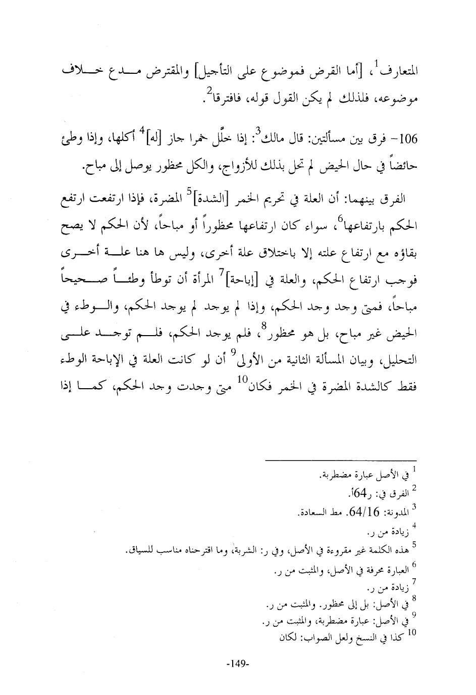 106 - فرق بين مسألتين: قال مالك (¬3): إذا خلَّل خمرا جاز [له] (¬4) أكلها، وإذا وطئ حائضًا في حال الحيض لم تحل بذلك للأزواج، والكل محظور يوصل إلى مباح.