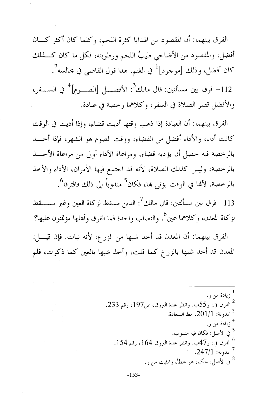 (¬6) الفرق في: ر 47 ب. وانظر عدة البروق 164، رقم 154.