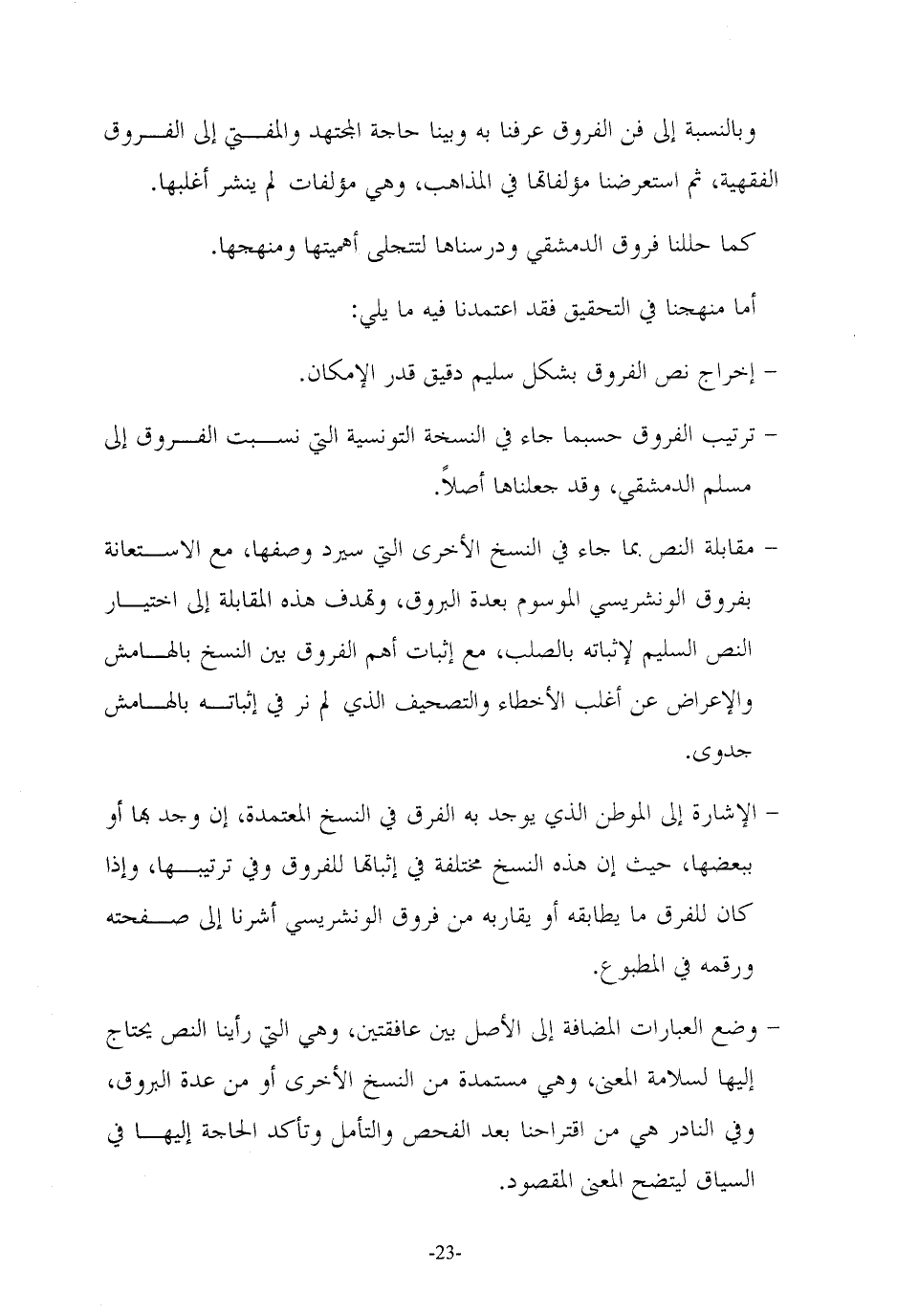 - مقابلة النص بما جاء في النسخ الأخرى التي سيرد وصفها، مع الاستعانة بفروق الونشريسي الموسوم بعدة البروق، وتهدف هذه المقابلة إلى اختيار النص السليم لإثباته بالصلب، مع إثبات أهم الفروق بين النسخ بالهامش والإعراض من أغلب الأخطاء والتصحيف الذي لم نر في إثباته بالهامش جدوى.