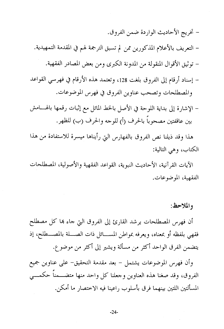 وأن فهرس الموضوعات يشتمل -بعد مقدمة التحقيق- على عناوين جميع الفروق، وقد صغنا هذه العناوين وجعلنا كل واحد منها متضمناً حكمي المسألتين اللتين بينهما فرق بأسلوب راعينا فيه الاختصار ما أمكن.