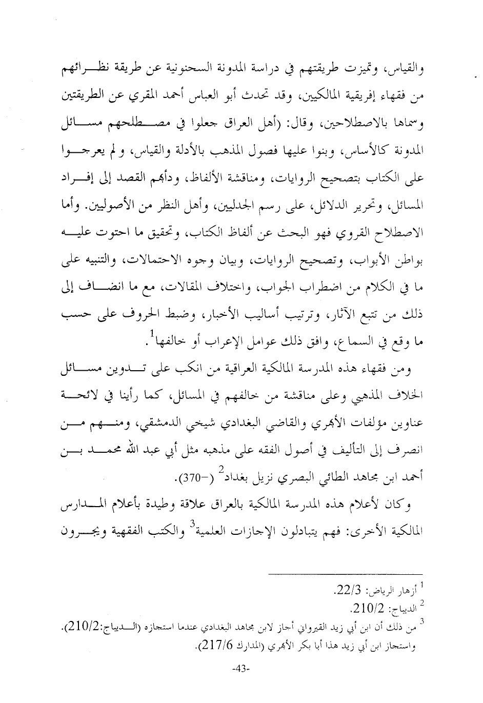 والقياس، وتميزت طريقتهم في دراسة المدونة السحنونية عن طريقة نظرائهم من فقهاء إفريقية المالكيين، وقد تحدث أبو العباس أحمد المقري عن الطريقتين وسماها بالاصطلاحين، وقال: (أهل العراق جعلوا في مصطلحهم مسائل المدونة كالأساس، وبنوا عليها فصول المذهب بالأدلة والقياس، ولم يعرجوا على الكتاب بتصحيح الروايات، ومناقشة الألفاظ، ودأبهم القصد إلى إفراد المسائل، وتحرير الدلائل، على رسم الجدليين، وأهل النظر من الأصوليين. وأما الاصطلاح القروي فهو البحث عن ألفاظ الكتاب، وتحقيق ما احتوت عليه بواطن الأبواب، وتصحيح الروايات، وبيان وجود الاحتمالات، والتنبيه على ما في الكلام من اضصراب الجواب، واختلاف المقالات، مع ما انضاف إلى ذلك من تتبع الآثار، وترتيب أساليب الأخبار، وضبط الحروف على حسب ما وقع في السماع، وافق ذلك عوامل الإعراب أو خالفها (¬1).