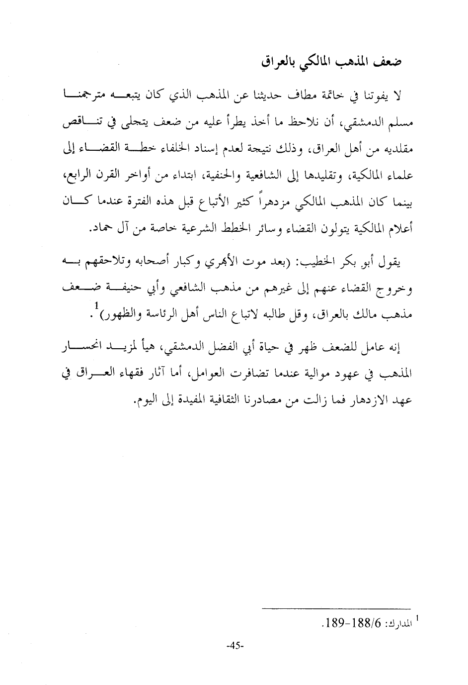 لا يفوتنا في خاتمة مطاف حديثنا عن المذهب الذي كان يتبعه مترجمنا مسلم الدمشقي، أن نلاحظ ما أخذ يطرأ عليه من ضعف يتجلى في تناقص مقلديه من أهل العراق، وذلك نتيجة لعدم إسناد الخلفاء خطة القضاء إلى علماء المالكية، وتقليدها إلى الشافعية والحنفية، ابتداء من أواخر القرن الرابع، بينما كان المذهب المالكي مزدهراً كثير الأتباع قبل هذه الفترة عندما كان أعلام المالكية يتولون القضاء وسائر الخطط الشرعية خاصة من آل حماد.
