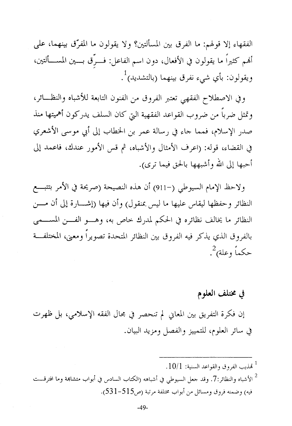 (¬2) الأشباه والنظائر: 7. وقد جعل السيوطي في أشباهه (الكتاب السادس في أبواب متشابهة وما افترقت فيه) وضمنه فروق ومسائل من أبواب مختلفة مرتبة (ص 515 - 531).