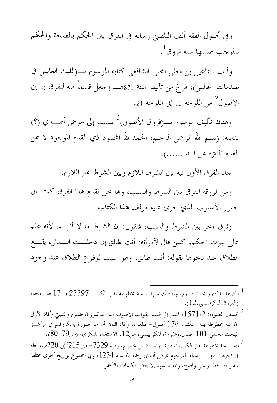 (¬1) ذكرها الدكتور محمد طموم، وأفاد أن منها نسخة نحطوطة بدار الكتب: 25597 بـ 17 صفحة، (الفروق للكرابيسي: 12).