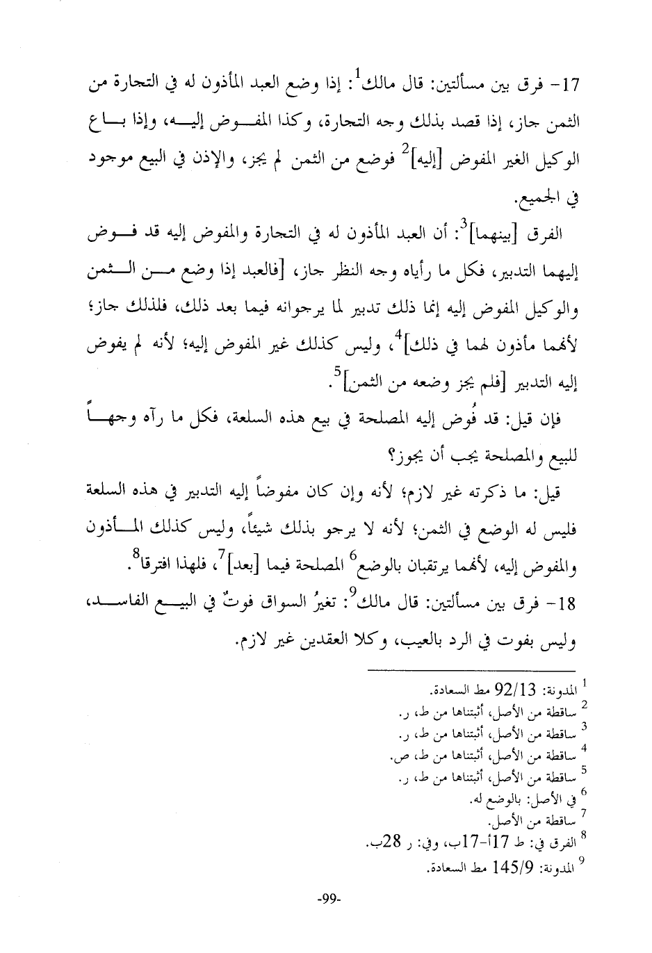 17 - فرق بين مسألتين: قال مالك (¬1): إذا وضع العبد المأذون له في التجارة من الثمن جاز، إذا قصد بذلك وجه التجارة، وكذا المفوض إليه، وإذا باع الوكيل الغير المفوض [إليه] (¬2) فوضع من الثمن لم يجز، والإذن في البيع موجود في الجميع.