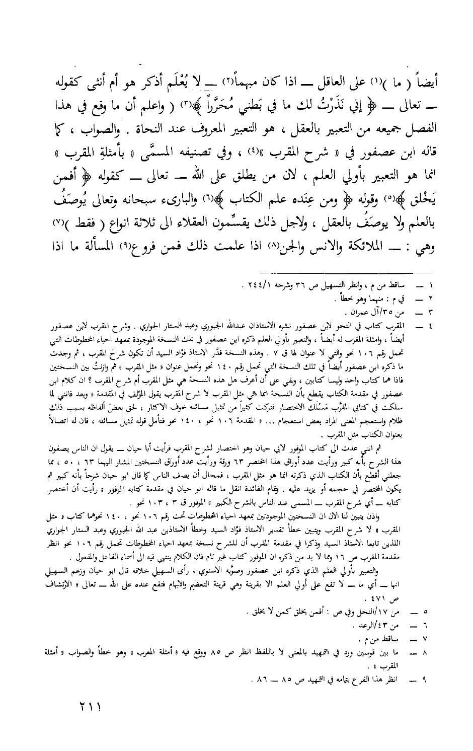 الْفَصْل جَمِيعه من التَّعْبِير بِالْعقلِ هُوَ التَّعْبِير الْمَعْرُوف عِنْد النُّحَاة وَالصَّوَاب كَمَا قَالَه ابْن عُصْفُور فِي شرح المقرب وَفِي تصنيفه الْمُسَمّى بأمثلة المقرب إِنَّمَا هُوَ التَّعْبِير بأولي الْعلم لِأَن من يُطلق على الله تَعَالَى كَقَوْلِه {أَفَمَن يخلق} وَقَوله {وَمن عِنْده علم الْكتاب} والبارىءسبجانه وَتَعَالَى يُوصف بِالْعلمِ وَلَا يُوصف بِالْعقلِ وَلأَجل ذَلِك يقسمون الْعُقَلَاء إِلَى ثَلَاثَة أَنْوَاع فَقَط وَهِي الْمَلَائِكَة وَالْإِنْس وَالْجِنّ إِذا علمت ذَلِك فَمن فروع الْمَسْأَلَة مَا إِذا