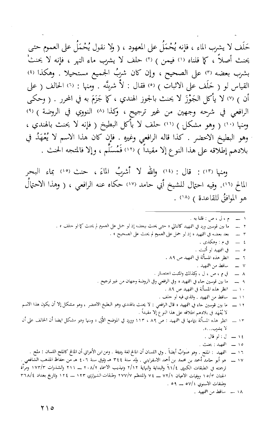 وَمِنْهَا قَالَ وَالله لَا أشْرب المَاء حنث بِمَاء الْبَحْر المالح وَفِيه احْتِمَال للشَّيْخ أبي حَامِد حَكَاهُ عَنهُ الرَّافِعِيّ (وَهَذَا الِاحْتِمَال هُوَ الْمُوَافق للقاعدة)