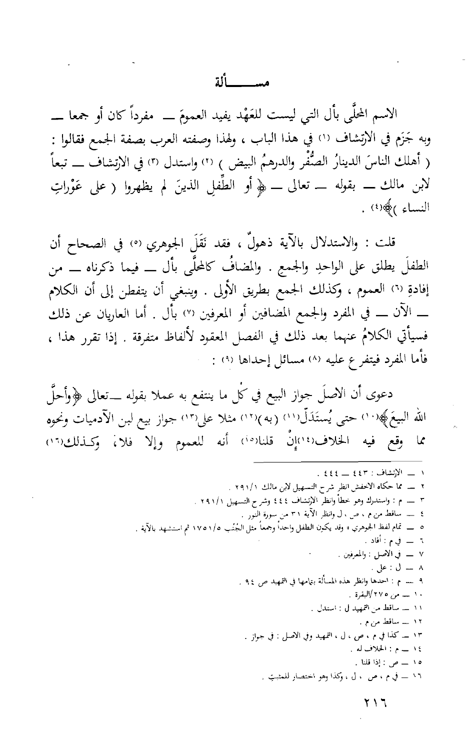 الِاسْم الْمحلى بأل الَّتِي لَيست للْعهد يُفِيد الْعُمُوم مُفردا كَانَ أَو جمعا وَبِه جزم فِي الارتشاف فِي هَذَا الْبَاب وَلِهَذَا وَصفته الْعَرَب بِصفة الْجمع فَقَالُوا (أهلك النَّاس الدِّينَار الصفر وَالدِّرْهَم الْبيض) وَاسْتدلَّ فِي الارتشاف تبعا لِابْنِ مَالك بقوله تَعَالَى {أَو الطِّفْل الَّذين لم يظهروا على عورات النِّسَاء} )