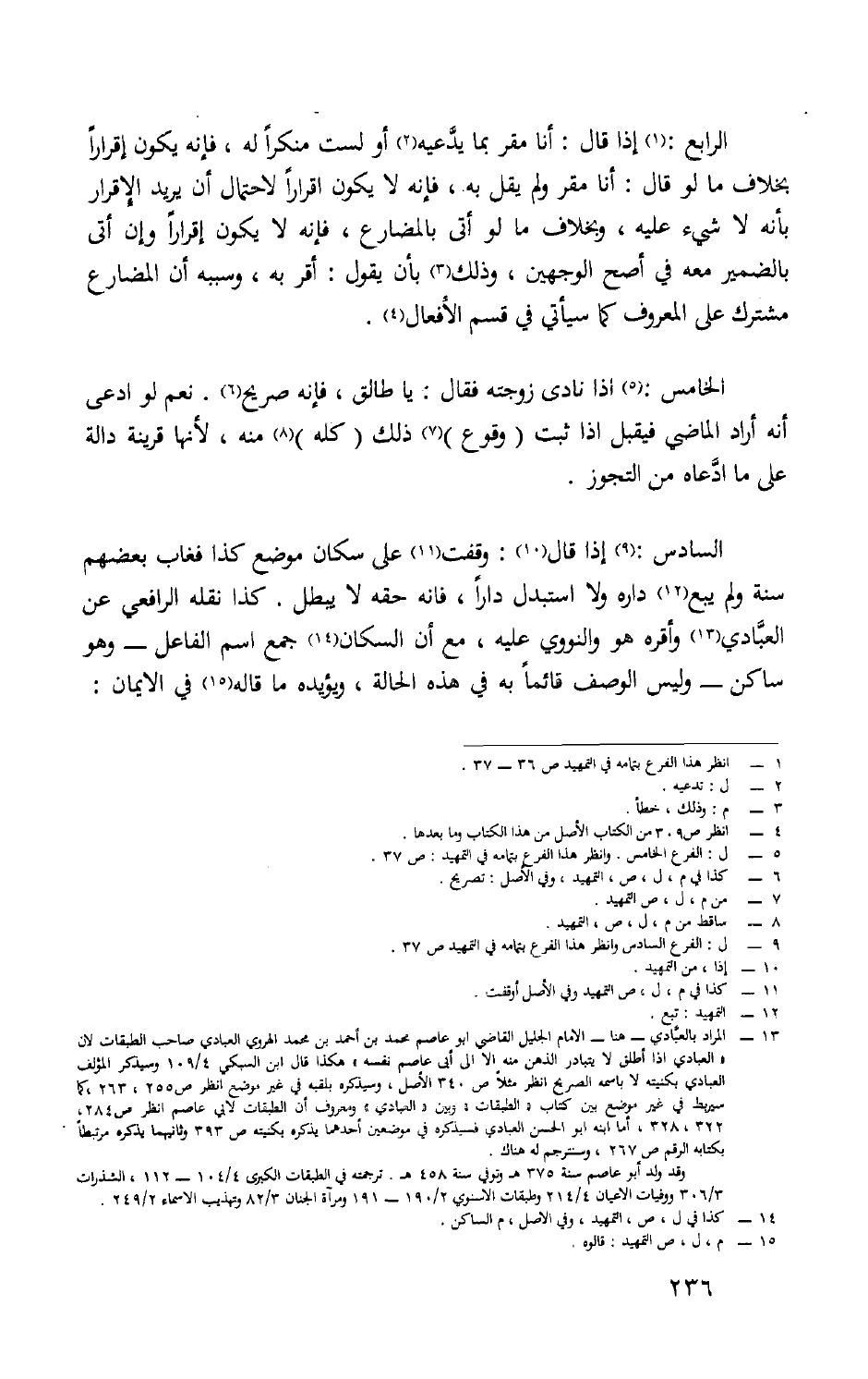الرَّابِع إِذا قَالَ أَنا مقرّ بِمَا يَدعِيهِ أَو لست مُنْكرا لَهُ فَإِنَّهُ يكون إِقْرَارا بِخِلَاف مالو قَالَ أَنا مقرّ وَلم يقل بِهِ فَإِنَّهُ لَا يكون إِقْرَارا لاحْتِمَال أَن يُرِيد الْإِقْرَار بِأَنَّهُ لَا شَيْء عَلَيْهِ وَبِخِلَاف مَا لَو أَتَى بالمضارع فَإِنَّهُ لَا يكون إِقْرَارا وَإِن أَتَى بالضمير مَعَه فِي أصح الْوَجْهَيْنِ وَذَلِكَ بِأَن يَقُول أقرّ بِهِ وَسَببه أَن الْمُضَارع مُشْتَرك على الْمَعْرُوف كَمَا سَيَأْتِي فِي قسم الْأَفْعَال