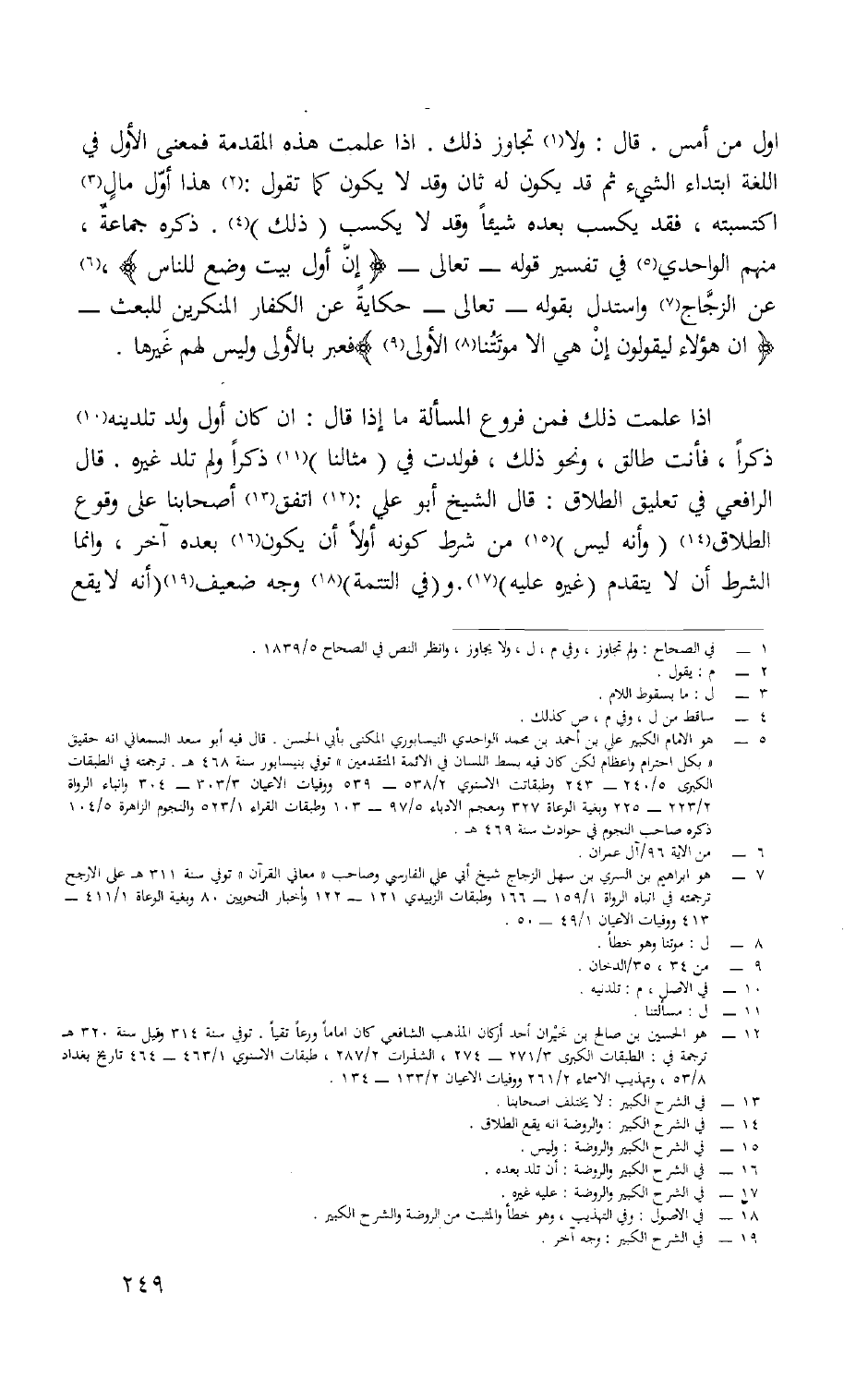 أول من أمس قَالَ وَلَا تجَاوز ذَلِك إِذا علمت هَذِه الْمُقدمَة فَمَعْنَى الأول فِي اللُّغَة ابْتِدَاء الشَّيْء ثمَّ قد يكون لَهُ ثَان وَقد لَا يكون كَمَا تَقول هَذَا أول مَال اكتسبته فقد يكْسب بعده شَيْئا وَقد لَا يكْسب ذَلِك ذكره جمَاعَة مِنْهُم الواحدي فِي تَفْسِير قَوْله تَعَالَى {إِن أول بَيت وضع للنَّاس} عَن الزّجاج وَاسْتدلَّ بقوله تَعَالَى حِكَايَة عَن الْكفَّار المنكرين للبعث {إِن هَؤُلَاءِ ليقولون إِن هِيَ إِلَّا موتتنا الأولى} فَعبر بِالْأولَى وَلَيْسَ لَهُم غَيرهَا