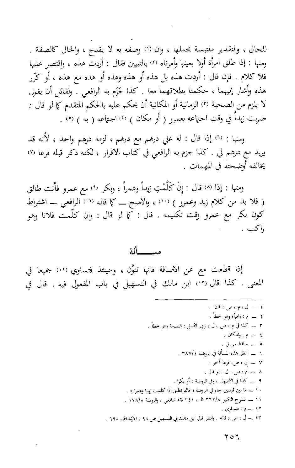 وَمِنْهَا إِذا قَالَ إِن كلمت زيدا وعمرا وَبكر مَعَ عَمْرو فَأَنت طَالِق فَلَا بُد من كَلَام زيد وَعَمْرو وَالأَصَح كَمَا قَالَه الرَّافِعِيّ اشْتِرَاط كَون بكر مَعَ عَمْرو وَقت تكليمه قَالَ كَمَا لَو قَالَ وَإِن كلمت فلَانا وَهُوَ رَاكب