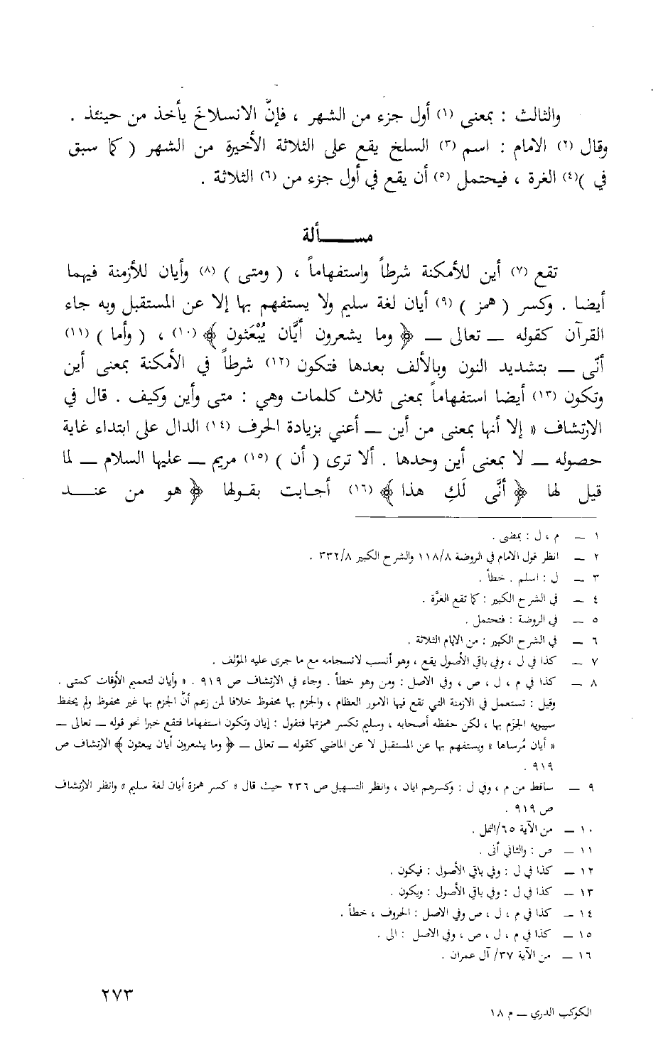 تقع أَيْن للأمكنة شرطا واستفهاما (وَمَتى) وأيان للأزمنة فيهمَا أَيْضا وَكسر (همز) أَيَّانَ لُغَة سليم وَلَا يستفهم بهَا إِلَّا عَن الْمُسْتَقْبل وَبِه جَاءَ الْقُرْآن كَقَوْلِه تَعَالَى {وَمَا يَشْعُرُونَ أَيَّانَ يبعثون} وَأما أَنى بتَشْديد النُّون وبالألف بعْدهَا فَتكون شرطا فِي الْأَمْكِنَة بِمَعْنى أَيْن وَتَكون أَيْضا استفهاما بِمَعْنى ثَلَاث كَلِمَات وَهِي مَتى وَأَيْنَ وَكَيف قَالَ فِي الارتشاف إِلَّا أَنَّهَا بِمَعْنى من أَيْن أَعنِي بِزِيَادَة الْحَرْف الدَّال على ابْتِدَاء غَايَة حُصُوله لَا بِمَعْنى أَيْن وَحدهَا أَلا ترى (أَن) مَرْيَم عَلَيْهَا السَّلَام لما قيل لَهَا {أَنى لَك هَذَا} أجابت بقولِهَا {هُوَ من عِنْد الله} وَلم تقل هُوَ عِنْد الله بل (لَو أجابت بِهِ) لم يحصل الْمَقْصُود