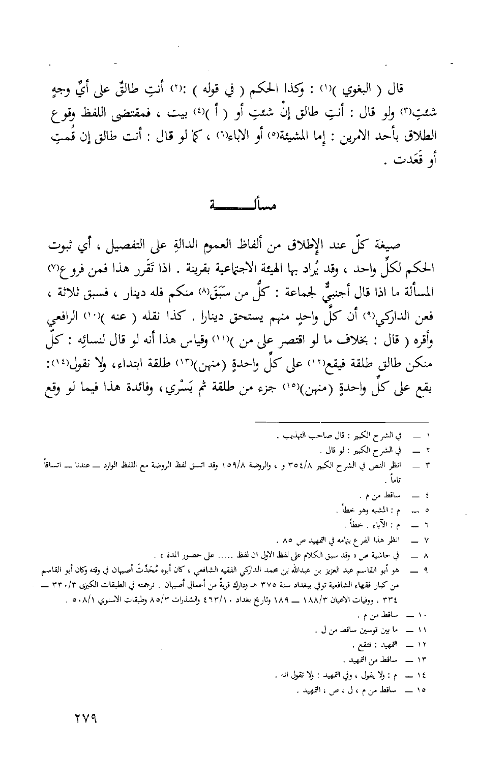 صِيغَة كل عِنْد الْإِطْلَاق من الفاظ الْعُمُوم الدَّالَّة على التَّفْصِيل أَي ثُبُوت الحكم لكل وَاحِد وَقد يُرَاد بهَا الْهَيْئَة الاجتماعية بِقَرِينَة إِذا تقرر هَذَا فَمن فروع الْمَسْأَلَة مَا إِذا قَالَ أَجْنَبِي لجَماعَة كل من سبق مِنْكُم فَلهُ دِينَار فَسبق ثَلَاثَة فَعَن الداركي أَن كل وَاحِد مِنْهُم يسْتَحق دِينَارا كَذَا نَقله عَنهُ الرَّافِعِيّ وَأقرهُ (قَالَ بِخِلَاف مالو اقْتصر على من) وَقِيَاس هَذَا انه لَو قَالَ لنسائه كل مِنْكُن طَالِق طَلْقَة فَيَقَع على كل وَاحِدَة مِنْهُنَّ طَلْقَة ابْتِدَاء وَلَا نقُول يَقع على كل وَاحِدَة مِنْهُنَّ جُزْء من طَلْقَة ثمَّ يسري وَفَائِدَة هَذَا فِيمَا لَو وَقع