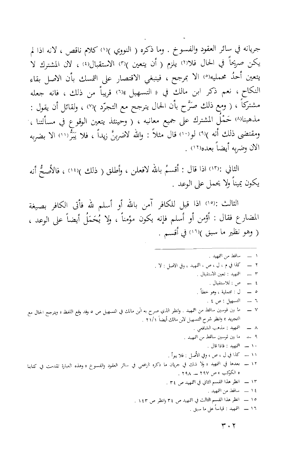 جَرَيَانه فِي سَائِر الْعُقُود والفسوخ وَمَا ذكره النَّوَوِيّ كَلَام نَاقص لِأَنَّهُ إِذا لم يكن صَرِيحًا فِي الْحَال فَلَا يلْزم أَن يتَعَيَّن الِاسْتِقْبَال لِأَن الْمُشْتَرك لَا يتَعَيَّن أحد محمليه إِلَّا بمرجح فَيَنْبَغِي الِاقْتِصَار على التَّمَسُّك بِأَن الأَصْل بَقَاء النِّكَاح نعم ذكر ابْن مَالك فِي التسهيل قَرِيبا من ذَلِك فَإِنَّهُ جعله مُشْتَركا وَمَعَ ذَلِك صرح بِأَن الْحَال يتَرَجَّح مَعَ التجرد وَلقَائِل أَن يَقُول مَذْهَبنَا حمل الْمُشْتَرك عل جَمِيع مَعَانِيه وَحِينَئِذٍ يتَعَيَّن الْوُقُوع فِي مَسْأَلَتنَا وَمُقْتَضى ذَلِك أَنه لَو قَالَ مثلا وَالله لَأَضرِبَن زيدا فَلَا يبر إِلَّا بضربه الْآن وضربه أَيْضا بعده