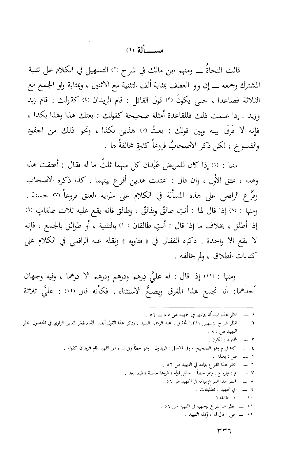 قَالَت النُّحَاة وَمِنْهُم ابْن مَالك فِي شرح التسهيل فِي الْكَلَام على تَثْنِيَة الْمُشْتَرك وَجمعه إِن وَاو الْعَطف بِمَثَابَة ألف التَّثْنِيَة مَعَ الِاثْنَيْنِ وبمثابة وَاو الْجمع مَعَ الثَّلَاثَة فَصَاعِدا حَتَّى يكون قَول الْقَائِل قَامَ الزيدان كَقَوْلِك قَامَ زيد وَزيد إِذا علمت ذَلِك فللقاعدة أَمْثِلَة صَحِيحَة كَقَوْلِك بِعْتُك هَذَا وَهَذَا بِكَذَا فَإِنَّهُ لَا فرق بَينه وَبَين قَوْلك بِعْت هذَيْن بِكَذَا وَنَحْو ذَلِك من الْعُقُود والفسوخ لَكِن ذكر الْأَصْحَاب فروعا كَثِيرَة مُخَالفَة لَهَا