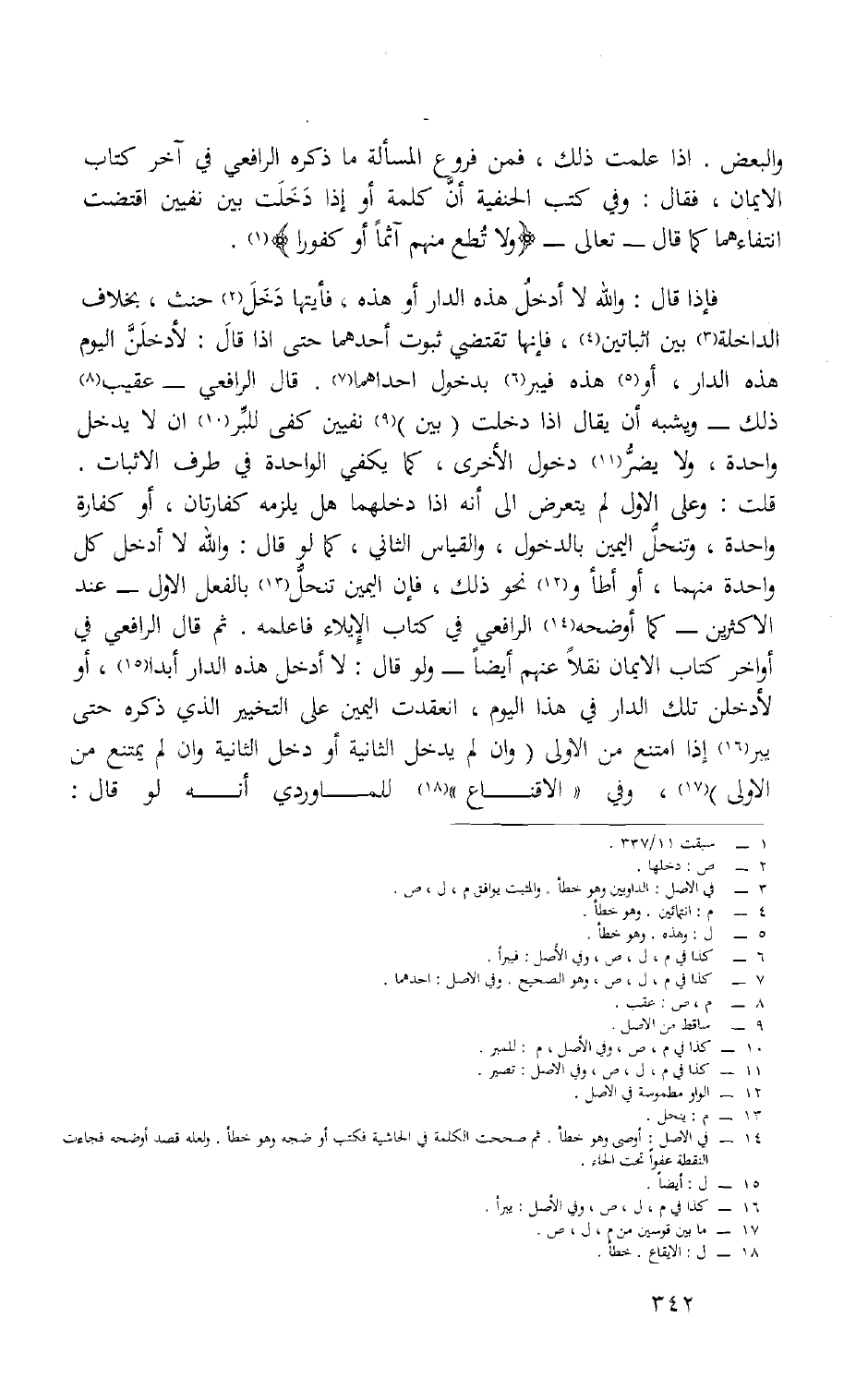 فَإِذا قَالَ وَالله لَا أَدخل هَذِه الدَّار أَو هَذِه فأيتها دخل حنث بِخِلَاف الدَّاخِلَة بَين إثباتين فَإِنَّهَا تَقْتَضِي ثُبُوت أَحدهمَا حَتَّى إِذا قَالَ لأدخلن الْيَوْم هَذِه الدَّار أَو هَذِه فيبر بِدُخُول إِحْدَاهمَا قَالَ الرَّافِعِيّ عقيب ذَلِك وَيُشبه أَن يُقَال إِذا دخلت بَين نفيين كفى للبر أَن لَا يدْخل وَاحِدَة وَلَا يضر دُخُول الْأُخْرَى كَمَا يَكْفِي الْوَاحِدَة فِي طرف الْإِثْبَات قلت وعَلى الأول لم يتَعَرَّض إِلَى أَنه إِذا دخلهما هَل يلْزمه كفارتان أَو كَفَّارَة وَاحِدَة وتنحل الْيَمين بِالدُّخُولِ وَالْقِيَاس الثَّانِي كَمَا لَو قَالَ وَالله لَا أَدخل كل وَاحِدَة مِنْهُمَا أَو أَطَأ وَنَحْو ذَلِك فَإِن الْيَمين تنْحَل بِالْفِعْلِ الأول عِنْد الْأَكْثَرين كَمَا أوضحه الرَّافِعِيّ فِي كتاب الْإِيلَاء فاعلمه ثمَّ قَالَ الرَّافِعِيّ فِي أَوَاخِر كتاب الايمان نقلا عَنْهُم أَيْضا وَلَو قَالَ لَا أَدخل هَذِه الدَّار أبدا أَو لأدخلن تِلْكَ الدَّار فِي هَذَا الْيَوْم انْعَقَدت الْيَمين على التَّخْيِير الَّذِي ذكره حَتَّى يبر إِذا امْتنع من الأولى وَإِن لم يدْخل الثَّانِيَة أَو دخل الثَّانِيَة وَإِن لم يمْتَنع من الأولى وَفِي الْإِقْنَاع للماوردي أَنه لَو قَالَ