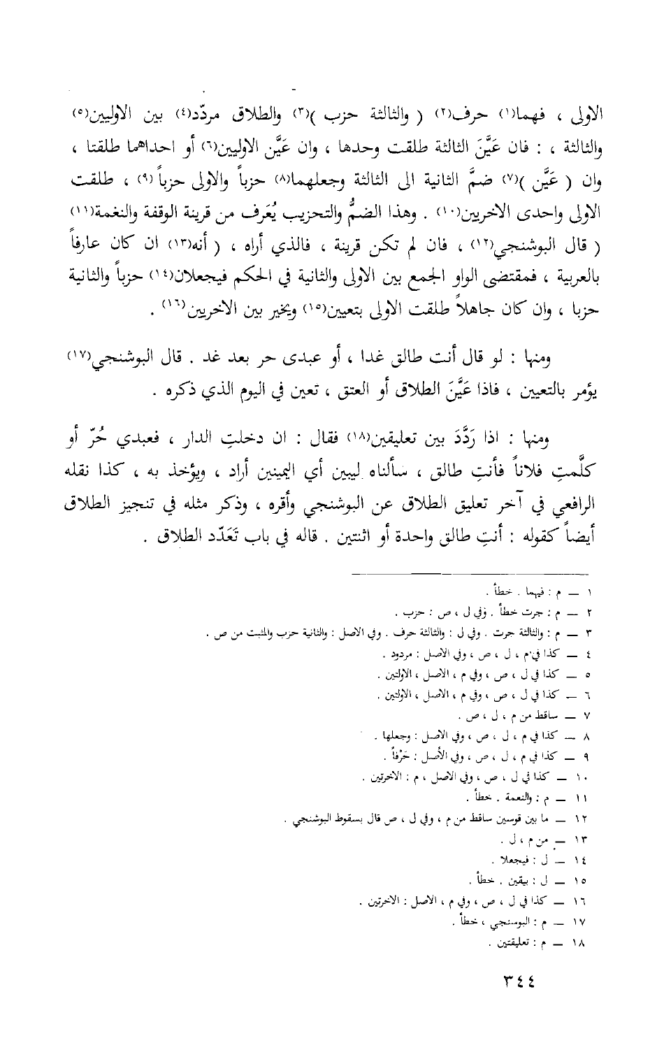 الأولى فهما حرف وَالثَّالِثَة حزب وَالطَّلَاق مردد بَين الْأَوليين وَالثَّالِثَة فَإِن عين الثَّالِثَة طلقت وَحدهَا وَإِن عين الْأَوليين أَو إِحْدَاهمَا طلقتا وَإِن عين ضم الثَّانِيَة إِلَى الثَّالِثَة وجعلهما حزبا وَالْأولَى حزبا طلقت الأولى وَإِحْدَى الْأُخْرَيَيْنِ وَهَذَا الضَّم والتحزيب يعرف من قرينَة الوقفة والنغمة قَالَ البوشنجي فَإِن لم تكن قرينَة فَالَّذِي أرَاهُ أَنه ان كَانَ عَارِفًا بِالْعَرَبِيَّةِ فَمُقْتَضى الْوَاو الْجمع بَين الأولى وَالثَّانيَِة فِي الحكم فيجعلان حزبا وَالثَّانيَِة حزبا وَإِن كَانَ جَاهِلا طلقت الأولى بِتَعْيِين وَيُخَير بَين الْأُخْرَيَيْنِ