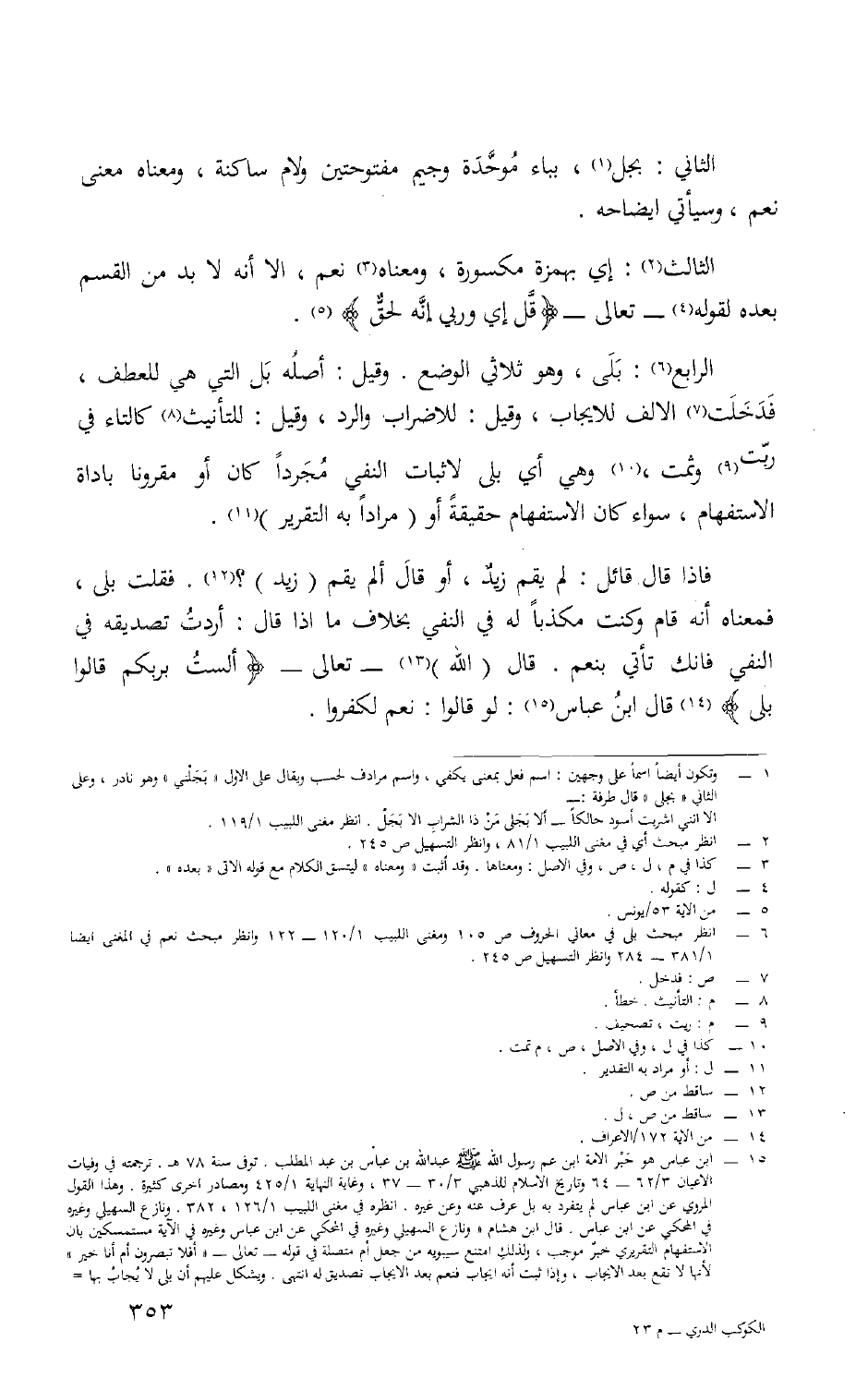 فَإِذا قَالَ قَائِل لم يقم زيد أَو قَالَ ألم يقم زيد فَقلت بلَى فَمَعْنَاه أَنه قَامَ وَكنت مُكَذبا لَهُ فِي النَّفْي بِخِلَاف مَا إِذا قَالَ أردْت تَصْدِيقه فِي النَّفْي فَإنَّك تَأتي بنعم قَالَ الله تَعَالَى {أَلَسْت بربكم قَالُوا بلَى} قَالَ ابْن عَبَّاس لَو قَالُوا نعم لكفروا