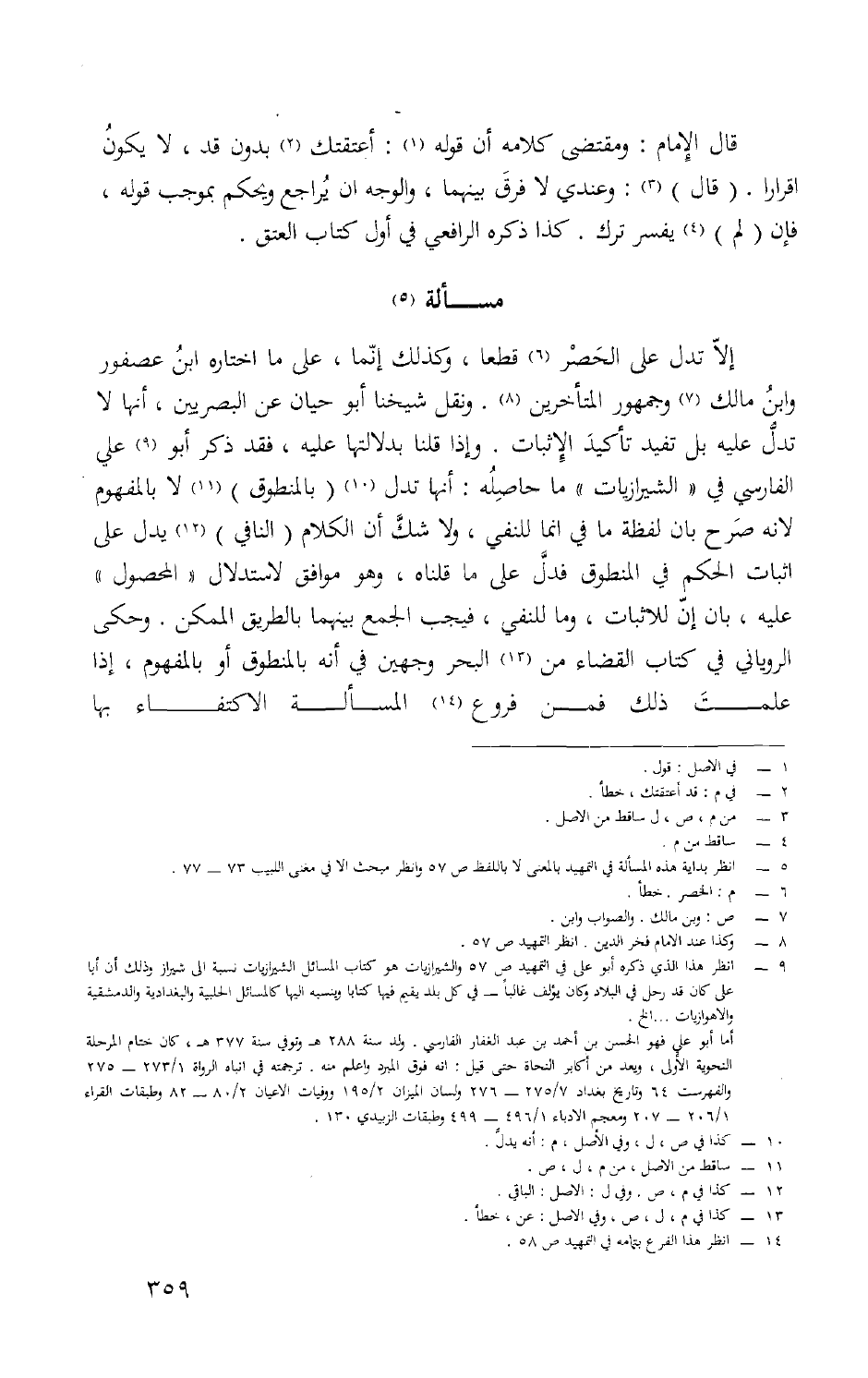 إِلَّا تدل على الْحصْر قطعا وَكَذَلِكَ إِنَّمَا على مَا اخْتَارَهُ ابْن عُصْفُور وَابْن مَالك وَجُمْهُور الْمُتَأَخِّرين وَنقل شَيخنَا أَبُو حَيَّان عَن الْبَصرِيين أَنَّهَا لَا تدل عَلَيْهِ بل تفِيد تَأْكِيد الْإِثْبَات وَإِذا قُلْنَا بدلالتها عَلَيْهِ فقد ذكر أَبُو عَليّ الْفَارِسِي فِي الشيرازيات مَا حَاصله أَنَّهَا تدل بالمنطوق لَا بِالْمَفْهُومِ لِأَنَّهُ صرح بِأَن لَفْظَة مَا فِي إِنَّمَا للنَّفْي وَلَا شكّ أَن الْكَلَام النَّافِي يدل على إِثْبَات الحكم فِي الْمَنْطُوق فَدلَّ على مَا قُلْنَاهُ وَهُوَ مُوَافق لاستدلال الْمَحْصُول عَلَيْهِ بَان أَن للإثبات وَمَا للنَّفْي فَيجب الْجمع بَينهمَا بِالطَّرِيقِ الْمُمكن وَحكى الرَّوْيَانِيّ فِي كتاب الْقَضَاء من الْبَحْر وَجْهَيْن فِي أَنه بالمنطوق أَو بِالْمَفْهُومِ إِذا علمت ذَلِك فَمن فروع الْمَسْأَلَة الِاكْتِفَاء بهَا