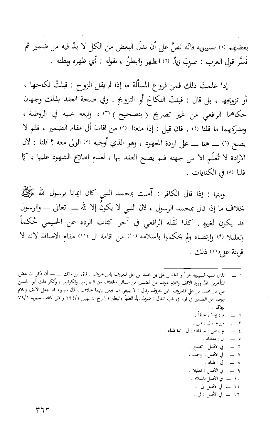 بَعضهم لسيبويه فَإِنَّهُ نَص على أَن بدل الْبَعْض من الْكل لَا بُد فِيهِ من ضمير ثمَّ فسر قَول الْعَرَب ضرب زيد الظّهْر والبطن بقوله أَي ظَهره وبطنه