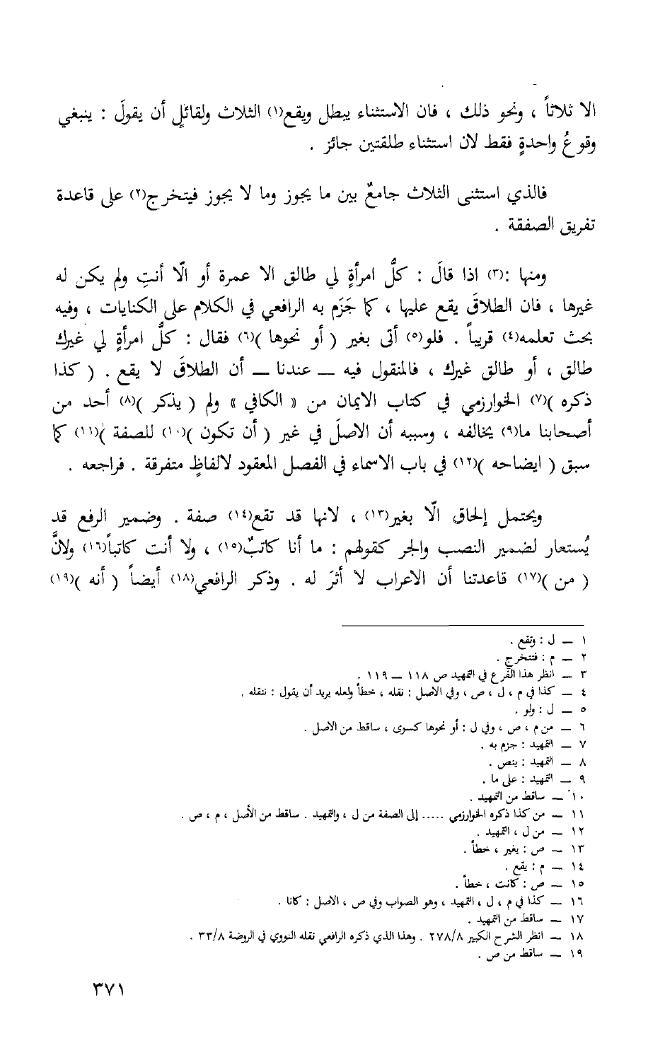ومنهاإذا قَالَ كل امْرَأَة لي طَالِق إِلَّا عمْرَة أَو إِلَّا أَنْت وَلم يكن لَهُ غَيرهَا فَإِن الطَّلَاق يَقع عَلَيْهَا كَمَا جزم بِهِ الرَّافِعِيّ فِي الْكَلَام على الْكِنَايَات وَفِيه بحث تعلمه قَرِيبا فَلَو أَتَى بِغَيْر أَو نَحْوهَا فَقَالَ كل امْرَأَة لي غَيْرك طَالِق أَو طَالِق غَيْرك فالمنقول فِيهِ عندنَا أَن الطَّلَاق لَا يَقع كَذَا ذكره الْخَوَارِزْمِيّ فِي كتاب الايمان من الْكَافِي وَلم يذكر أحد من أَصْحَابنَا مَا يُخَالِفهُ وَسَببه أَن الأَصْل فِي غير أَن تكون للصفة كَمَا سبق إيضاحه فِي بَاب الْأَسْمَاء فِي الْفَصْل الْمَعْقُود لألفاظ مُتَفَرِّقَة فَرَاجعه