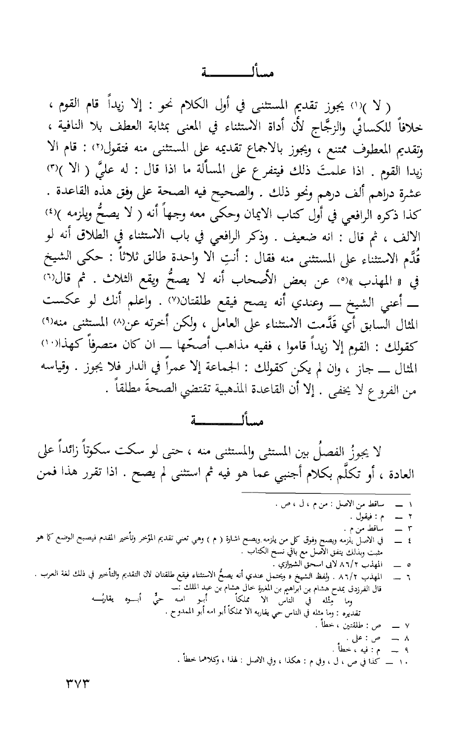 لايجوز تَقْدِيم الْمُسْتَثْنى فِي أول الْكَلَام نَحْو إِلَّا زيدا قَامَ الْقَوْم خلافًا للكسائي والزجاج لِأَن أَدَاة الِاسْتِثْنَاء فِي الْمَعْنى بِمَثَابَة الْعَطف بِلَا النافية وَتَقْدِيم الْمَعْطُوف مُمْتَنع وَيجوز بِالْإِجْمَاع تَقْدِيمه على الْمُسْتَثْنى مِنْهُ فَتَقول قَامَ قَامَ إِلَّا زيدا الْقَوْم إِذا علمت ذَلِك فيتفرع على الْمَسْأَلَة مَا إِذا قَالَ لَهُ عَليّ إِلَّا عشرَة دَرَاهِم ألف دِرْهَم وَنَحْو ذَلِك وَالصَّحِيح فِيهِ الصِّحَّة على وفْق هَذِه الْقَاعِدَة كَذَا ذكره الرَّافِعِيّ فِي أول كتاب الايمان وَحكى مَعَه وَجها أَنه لَا يَصح وَيلْزمهُ الْألف ثمَّ قَالَ أَنه ضَعِيف وَذكر الرَّافِعِيّ فِي بَاب الِاسْتِثْنَاء فِي الطَّلَاق أَنه لَو قدم الِاسْتِثْنَاء على الْمُسْتَثْنى مِنْهُ فَقَالَ أَنْت غلآ وَاحِدَة طَالِق ثَلَاثًا حكى الشَّيْخ فِي الْمُهَذّب عَن بعض الْأَصْحَاب أَنه لَا يَصح وَيَقَع الثَّلَاث ثمَّ قَالَ أَعنِي الشَّيْخ وَعِنْدِي أَنه يَصح فَيَقَع طَلْقَتَانِ وَاعْلَم أَنَّك لَو عكست الْمِثَال السَّابِق أَي قدمت الِاسْتِثْنَاء على الْعَامِل وَلَكِن أَخَّرته عَن الْمُسْتَثْنى مِنْهُ كَقَوْلِك الْقَوْم إِلَّا زيدا قَامُوا فَفِيهِ مَذَاهِب أَصَحهَا إِن كَانَ متصرفا كَهَذا الْمِثَال جَازَ وَإِن لم يكن كَقَوْلِك الْجَمَاعَة إِلَّا عمرا فِي الدَّار فَلَا يجوز وَقِيَاسه من الْفُرُوع لَا يخفى إِلَّا أَن الْقَاعِدَة المذهبية تَقْتَضِي الصِّحَّة مُطلقًا
