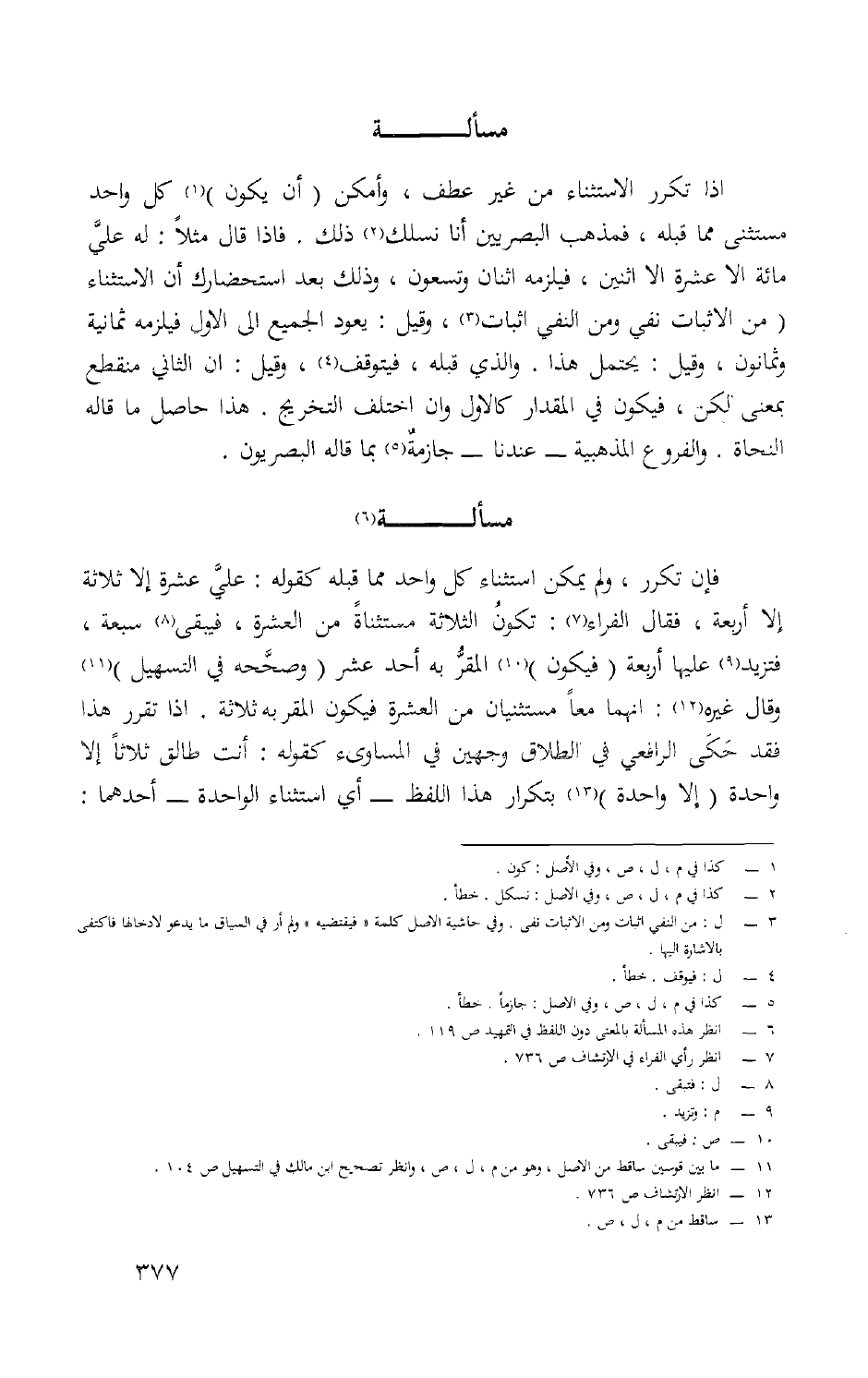 إِذا تكَرر الِاسْتِثْنَاء من غير عطف وَأمكن أَن يكون كل وَاحِد مُسْتَثْنى مِمَّا قبله فمذهب الْبَصرِيين أَنا نسلك ذَلِك فَإِذا قَالَ مثلا لَهُ عَليّ مائَة إِلَّا عشرَة إِلَّا اثْنَيْنِ فَيلْزمهُ اثْنَان وَتسْعُونَ وَذَلِكَ بعد استحضارك أَن الِاسْتِثْنَاء من الاثبات نفي وَمن النَّفْي إِثْبَات وَقيل يعود الْجَمِيع إِلَى الأول فَيلْزمهُ ثَمَانِيَة وَثَمَانُونَ وَقيل يحْتَمل هَذَا وَالَّذِي قبله فَيتَوَقَّف وَقيل إِن الثَّانِي مُنْقَطع بِمَعْنى لَكِن فَيكون فِي الْمِقْدَار كَالْأولِ وَإِن اخْتلف التَّخْرِيج هَذَا حَاصِل مَا قَالَه النُّحَاة وَالْفُرُوع المذهبية عندنَا جازمة بِمَا قَالَه البصريون