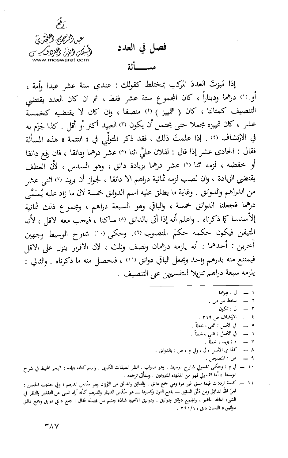 إِذا ميزت الْعدَد الْمركب بمختلط كَقَوْلِك عِنْدِي سِتَّة عشر عبدا وَأمة أَو درهما ودينارا كَانَ الْمَجْمُوع سِتَّة عشر فَقَط ثمَّ إِن كَانَ الْعدَد يَقْتَضِي التنصيف كمثالنا كَانَ التَّمْيِيز منصفا وَإِن كَانَ لَا يَقْتَضِيهِ كخمسة عشر كَانَ تَمْيِيزه مُجملا حَتَّى يحْتَمل أَن يكون العبيد أَكثر أَو أقل كَذَا جزم بِهِ فِي الارتشاف إِذا علمت ذَلِك فقد ذكر الْمُتَوَلِي فِي التَّتِمَّة هَذِه الْمَسْأَلَة قَالَ الْحَادِي عشر إِذا قَالَ لفُلَان عَليّ اثْنَا عشر درهما ودانقا فَإِن رفع دانقا أَو خفضه لزمَه اثْنَا عشر درهما بِزِيَادَة دانق وَهُوَ السُّدس لِأَن الْعَطف يَقْتَضِي الزِّيَادَة وَإِن نصب لزمَه ثَمَانِيَة دَرَاهِم إِلَّا دانقا لجَوَاز أَن يُرِيد اثْنَي عشر من الدَّرَاهِم والدوانق وَغَايَة مَا يُطلق عَلَيْهِ اسْم الدوانق خَمْسَة لِأَن مَا زَاد عَلَيْهِ يُسمى درهما فَجعلنَا الدوانق خَمْسَة وَالْبَاقِي وَهُوَ السَّبْعَة دَرَاهِم ومجموع ذَلِك ثَمَانِيَة إِلَّا سدسا كَمَا ذَكرْنَاهُ وَاعْلَم أَنه إِذا أَتَى بالدانق سَاكِنا فَيجب مَعَه الْأَقَل لِأَنَّهُ الْمُتَيَقن فَيكون حكمه حكم الْمَنْصُوب وَحكى شَارِح الْوَسِيط وَجْهَيْن آخَرين أَحدهمَا أَنه يلْزمه دِرْهَمَانِ وَنصف وَثلث لِأَن الْإِقْرَار ينزل على الْأَقَل فَيمْتَنع مِنْهُ بدرهم وَاحِد وَيجْعَل الْبَاقِي دوانق فَيحصل مِنْهُ مَا ذَكرْنَاهُ وَالثَّانِي يلْزمه سَبْعَة دَرَاهِم تَنْزِيلا للتفسيرين على التنصيف